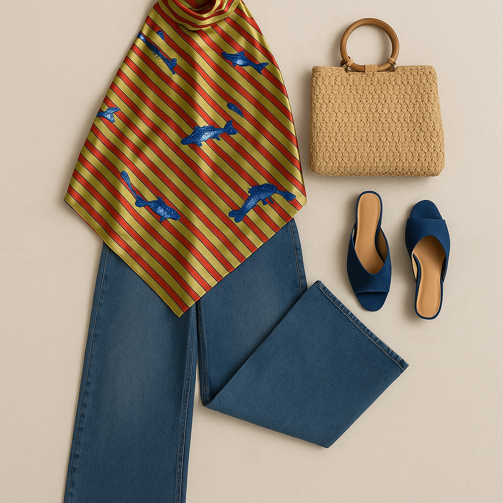 “A flat lay of a stylish summer outfit on a beige background. The ensemble includes a diagonal-striped halter top in mustard yellow and red with blue fish prints, paired with wide-leg blue jeans. A straw handbag with circular wooden handles is placed to the right, alongside a pair of navy blue open-toe mules. The clothing is arranged neatly to showcase the shape and flow of the top and the length of the jeans, with balanced spacing and no shadows or models”