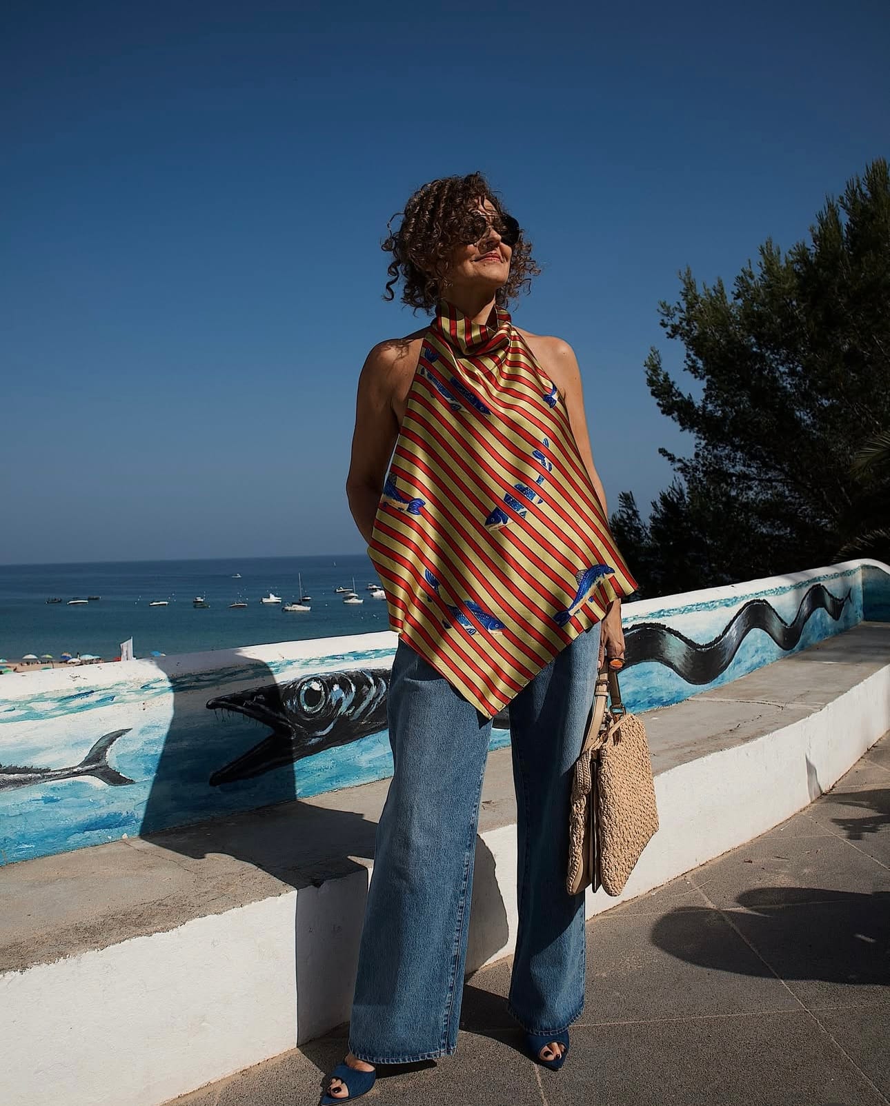 With sun in her eyes, a breeze in her hair, and fish dancing on her top, Renia Jaz gives us a look that’s as carefree as it is chic. Because style, when done right, feels like a vacation—even when you’re standing still.