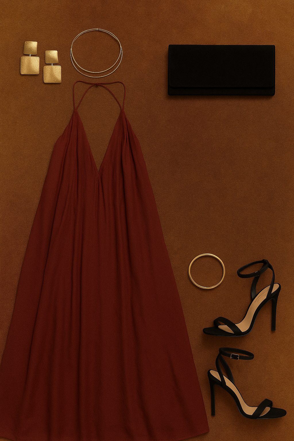 “A high-fashion flat lay against a rich golden-brown textured backdrop. The centerpiece is a deep burgundy halter-neck gown with flowy, pleated fabric. To the left of the dress are square-shaped gold statement earrings and a sleek double-layer gold choker. At the top right lies a minimalist black suede clutch. To the right of the gown are black high-heeled strappy sandals and a single gold bangle. The layout is neat, symmetrical, and editorial in style, with warm lighting and a luxurious, elegant vibe. No model, no text, no flat lay props besides the listed fashion items.”