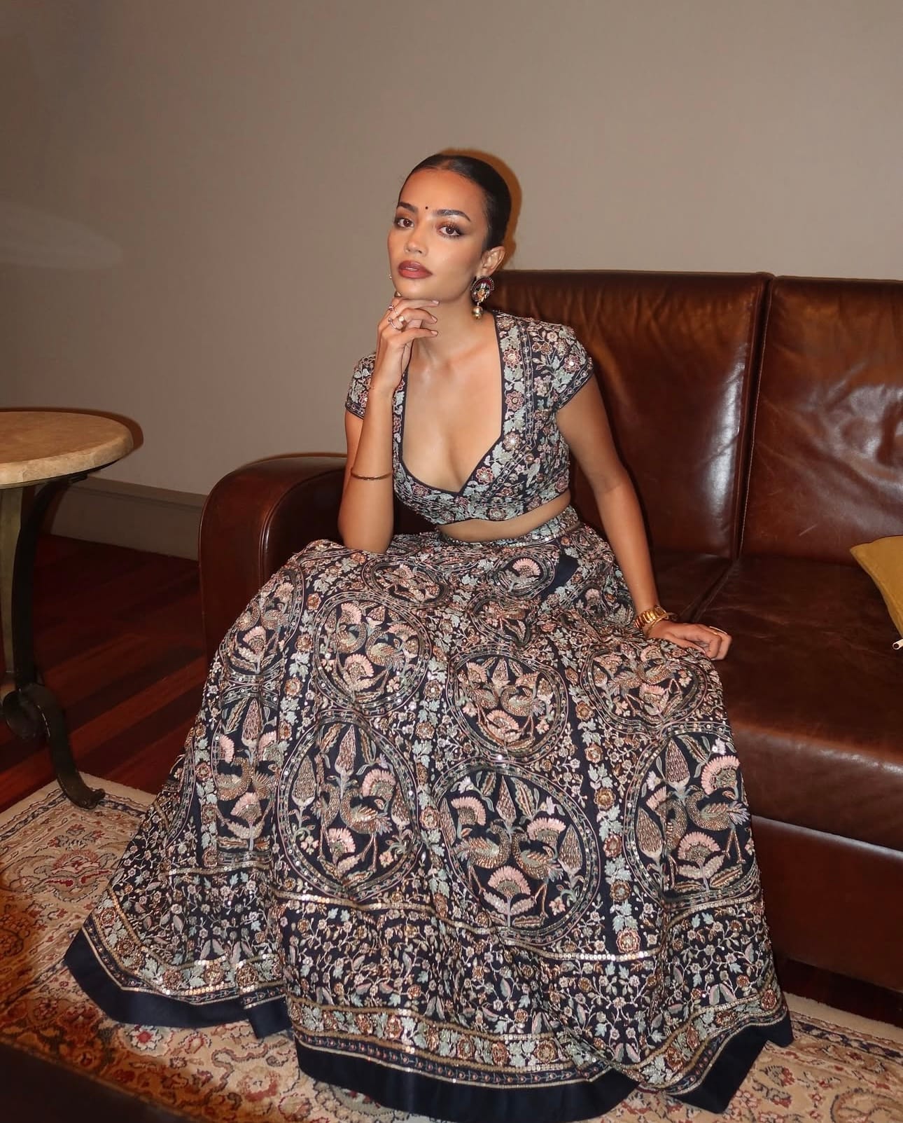 Her beauty styling continues the story of balance. A sleek, pulled-back bun emphasizes her neckline and facial structure, keeping the focus on the embroidery and jewelry. The makeup, with glowing skin, bronzed tones, and a deep brick-red lip, enhances her natural features without competing with the outfit. The shimmer across her eyelids mirrors the metallic embroidery, creating continuity between attire and makeup.