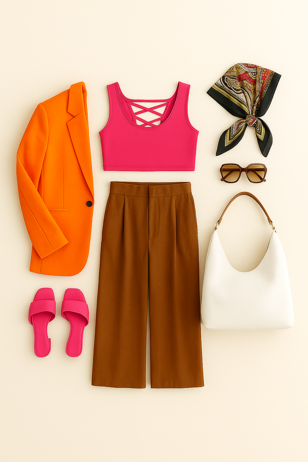 “Flat lay of a bold summer outfit on a cream background: orange folded blazer, hot pink lace-up crop top, brown wide-leg trousers, pink sandals, paisley headscarf, oversized brown sunglasses, and a white slouchy bag styled in a clean, editorial layout.”