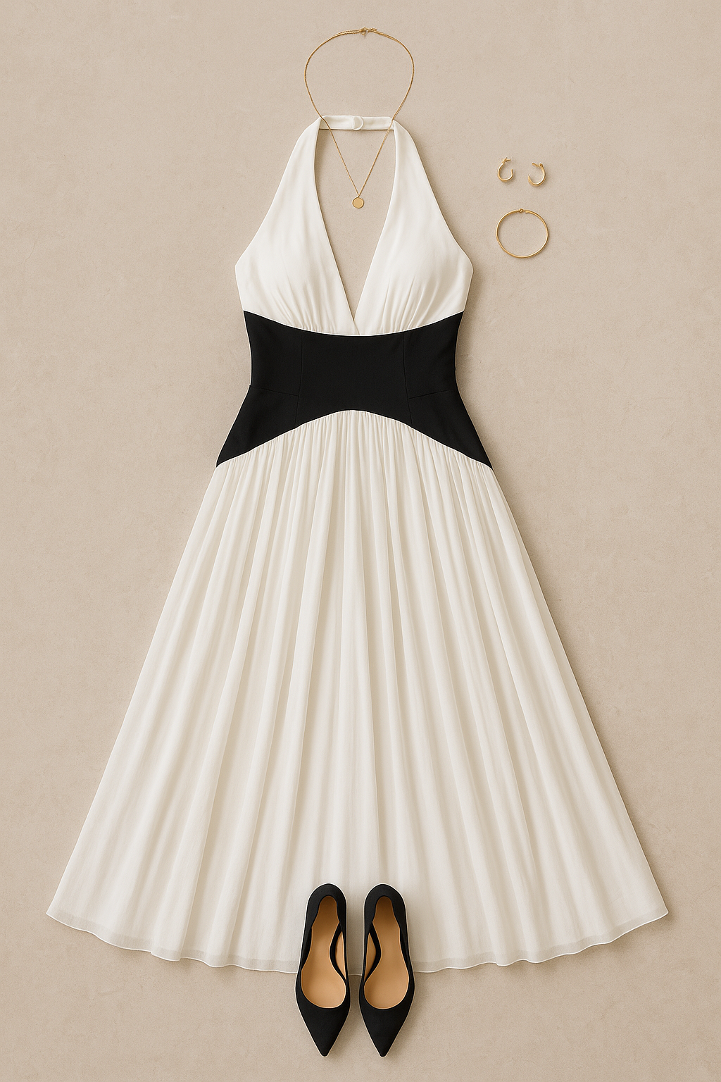 “Create a flat lay of a monochrome evening look. Center a flowing black-and-white halter gown with a deep neckline and pleated skirt. Place a delicate gold pendant necklace above the dress to highlight the neckline. Add subtle accessories such as a slim bracelet and simple earrings to one side for balance. Position a pair of black evening heels at the base of the gown to complete the look. The background should be neutral and softly textured, reflecting the elegance of her outfit without distraction. The arrangement must be clean, symmetrical, and styled to highlight sophistication and contrast.”