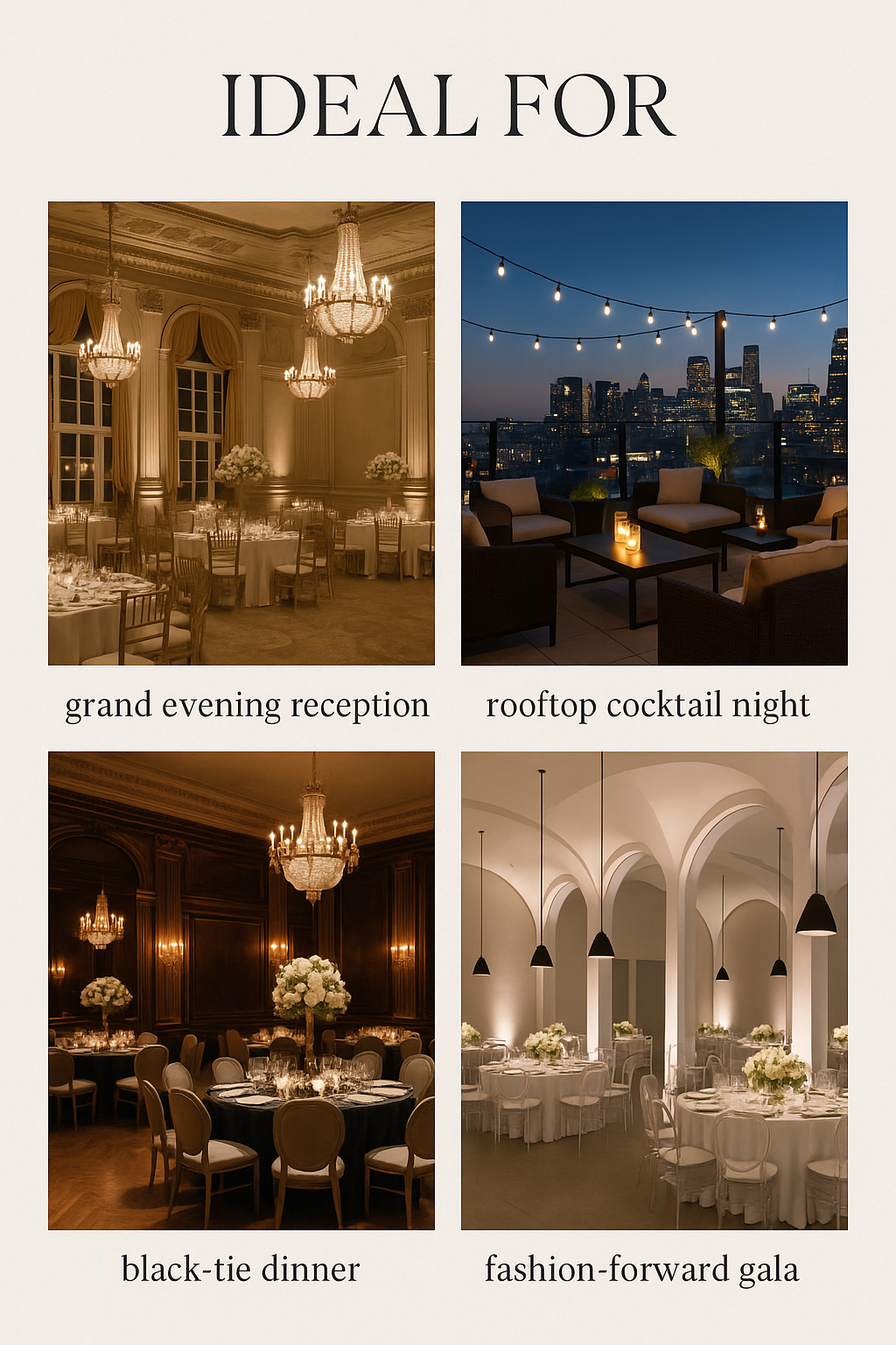 - Rooftop cocktail nights that call for sharp contrasts against city lights.