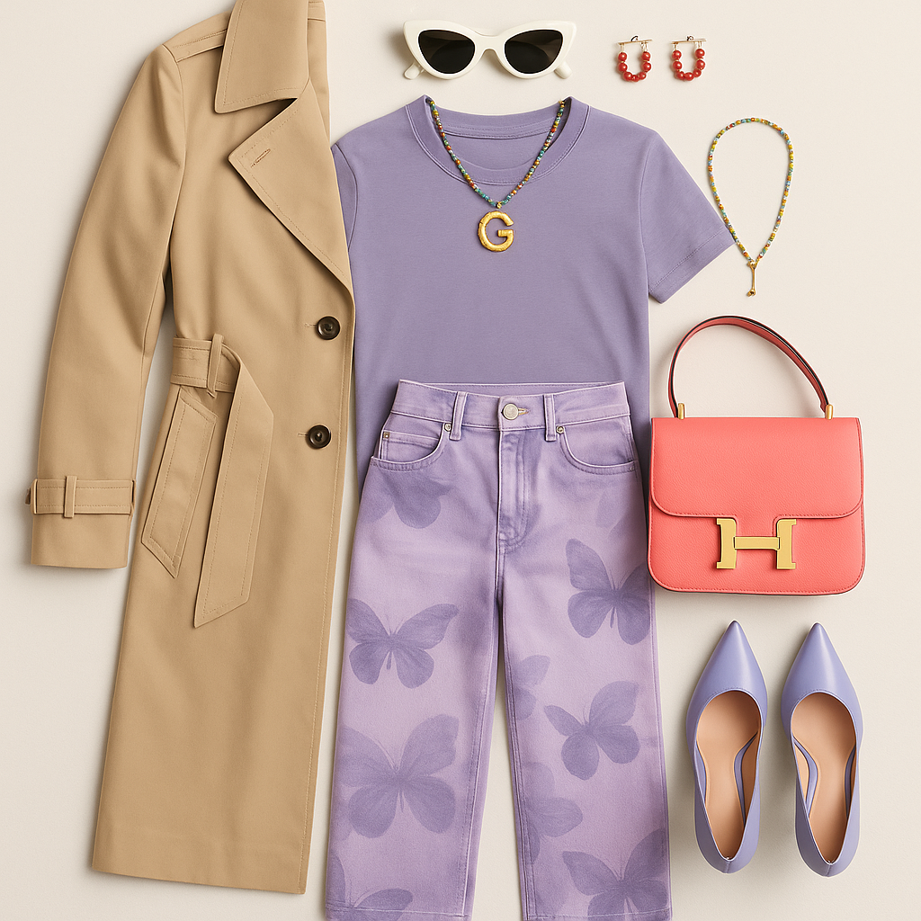 ‘‘Flat lay of a chic outfit on a beige background: beige trench coat, lavender tee, purple butterfly jeans, lilac pointed heels, coral handbag with gold hardware, gold ‘G’ necklace, white cat-eye sunglasses, red hoop earrings, and a silver watch. Stylish, symmetrical, and modern.”