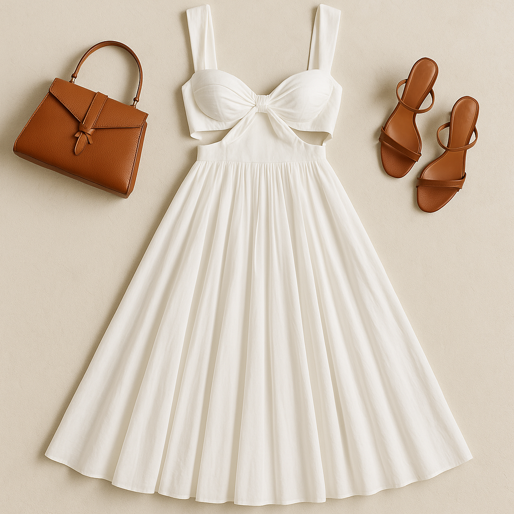 “A minimalist flat lay of a white midi sundress with a fitted bodice, wide straps, and a pleated skirt. The dress has a small cut-out below the bust and is paired with brown leather strappy heels and a structured brown leather handbag with a top handle. All items are laid on a soft beige background, evenly spaced for balance. The lighting is soft and natural, casting subtle shadows for depth”