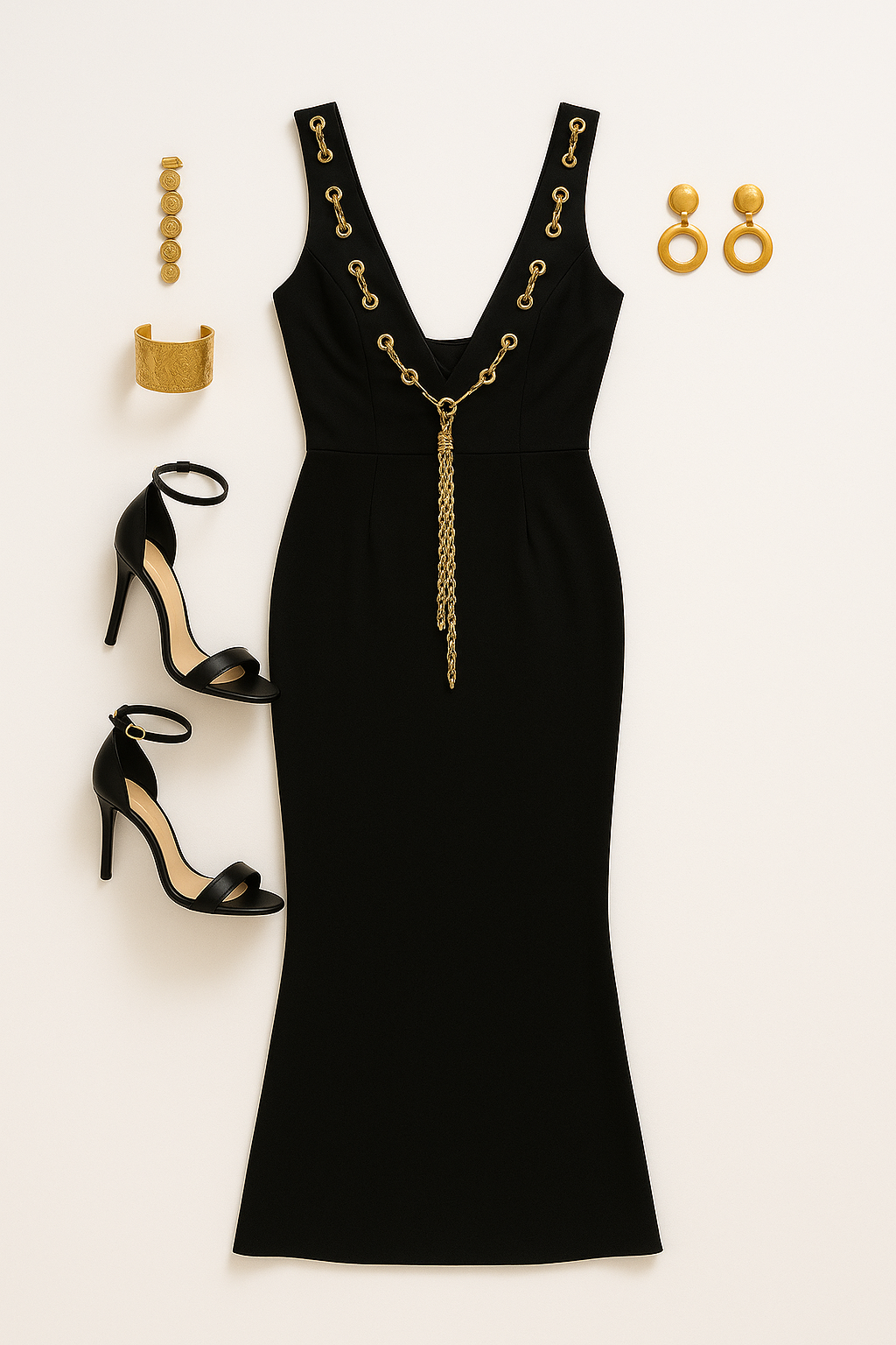 “Flat lay of an elegant black evening gown with a deep V-neckline, featuring gold chain details threaded through grommets and extending downward in the center. The full dress is displayed neatly against a crisp white background to make the ensemble pop. Surrounding the gown are complementary accessories: a pair of black high-heeled sandals placed to the left, a wide gold cuff bracelet, circular gold drop earrings, and a set of gold hair clips. The arrangement is minimal, balanced, and styled to highlight luxury and sophistication.”