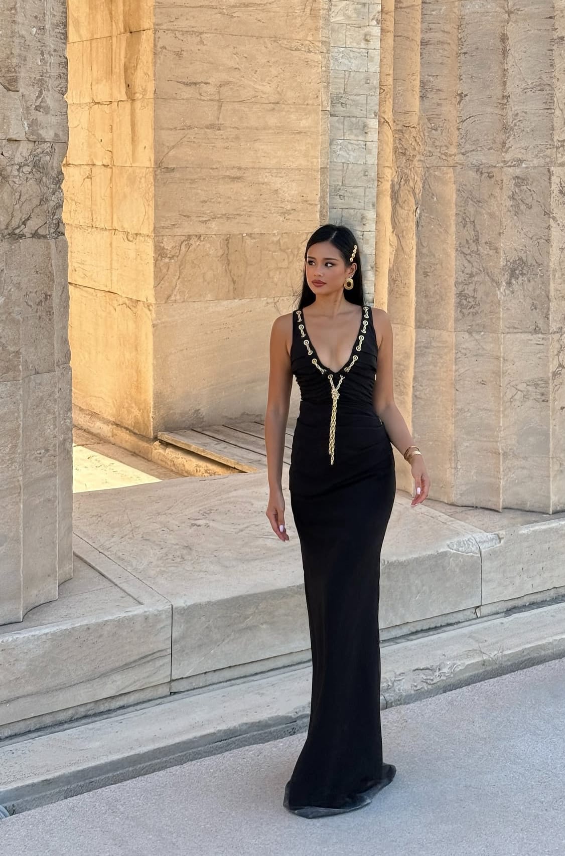 Her accessories echo the dress with thoughtful restraint. Golden earrings, bold yet refined, mirror the gleam of the chain detail, while hairpins set with gilded discs frame her profile with precision. A polished cuff at the wrist completes the composition, adding harmony without competing for attention. Everything works in dialogue with the gown, each choice reinforcing the conversation between black and gold.