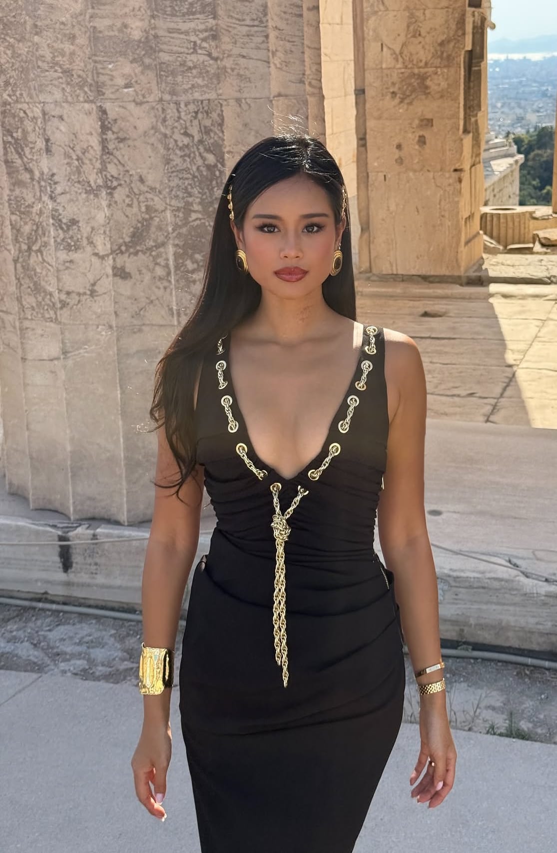 And then, of course, there is Pat herself. The way she inhabits the garment is what transforms it from couture into presence. Walking against ancient stone, sunlight igniting the gold at every step, she seems to belong to both past and present—an echo of classical goddesses, yet undeniably modern. It is her composure, her poise, her serene confidence that elevates the gown from exquisite fabric into a living story.