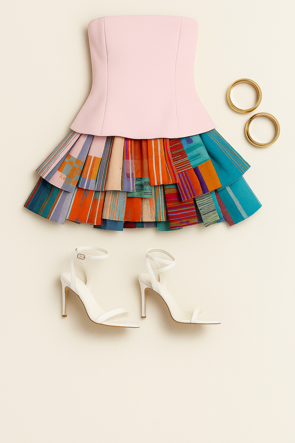“A flat lay digital photograph of a stylish outfit on a clean, neutral beige background. The ensemble includes a strapless pastel pink peplum corset top and a vibrant multicolored patchwork mini skirt with tiered, pleated layers. Positioned neatly beside the outfit are two chunky gold bangle bracelets and a pair of white high-heeled sandals with a single toe strap and ankle wrap, featuring a sharp pointed toe. The arrangement is minimal, well-lit, and elegant, capturing a fashion-forward aesthetic”