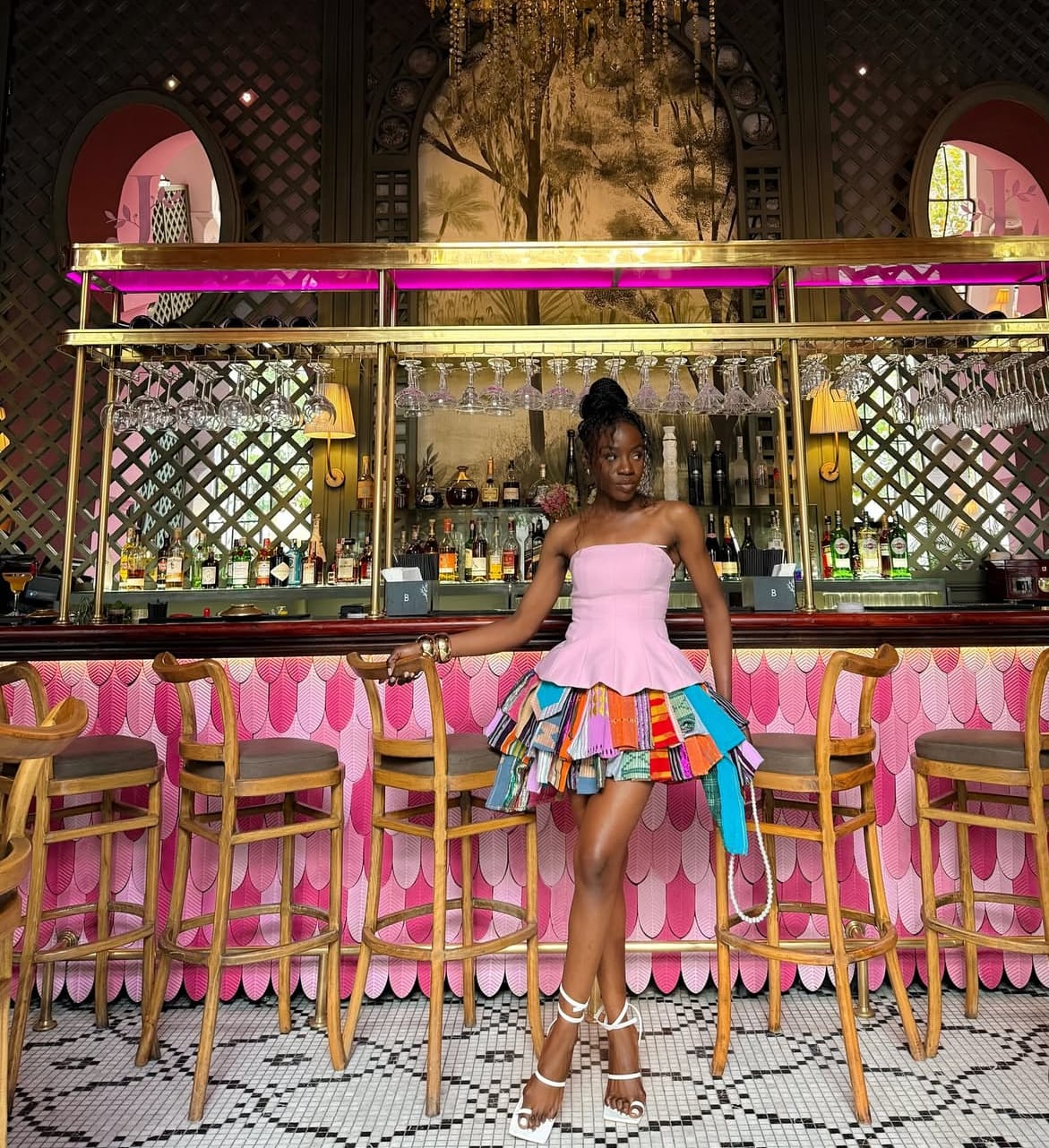 To perfectly complement this vibrant ensemble, Fikky selected strappy white heels—clean, minimalist, and decisively chic. The elegant wrap-around detail elevates the entire look, offering a delicate contrast to the colorful boldness above. These heels serve as the sophisticated punctuation to a playful narrative, effortlessly tying the whole look together.