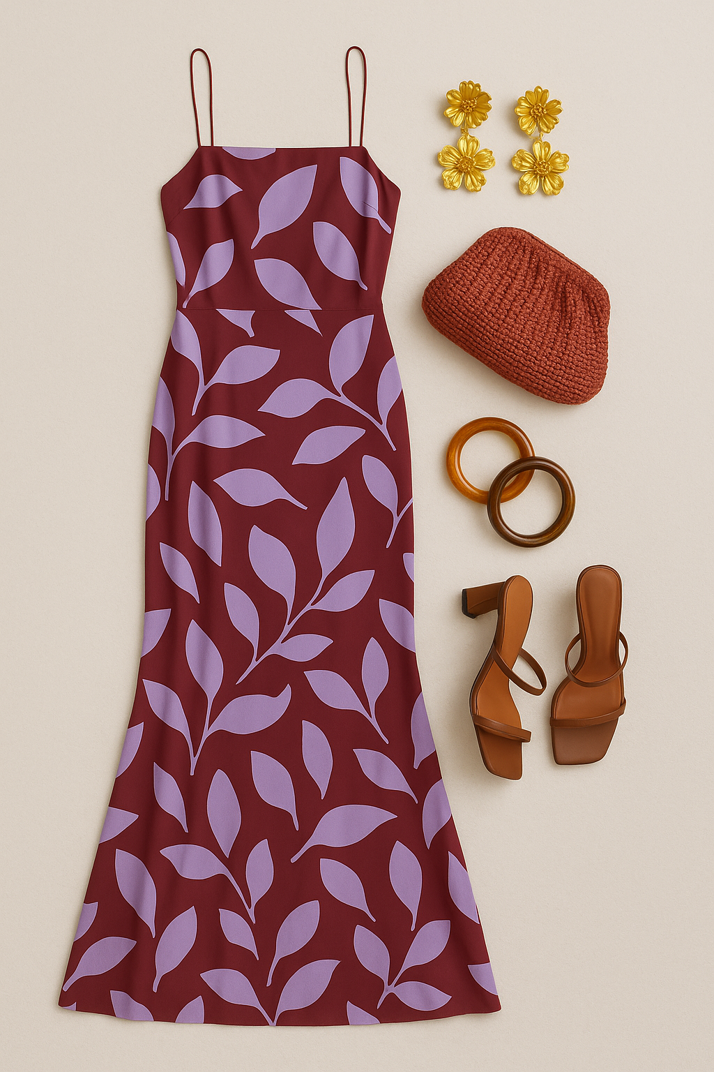 “Flat lay of a summer outfit on a beige background,a berry red spaghetti strap maxi dress with lavender leaf prints, brown mule sandals, rust-red woven clutch, gold floral earrings, and two resin bangles in amber and brown. No models, no text, clean and minimal ”