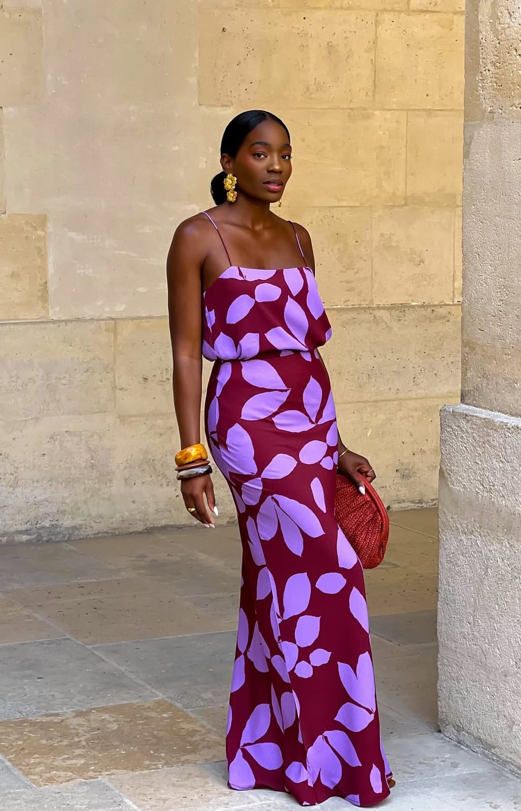 Start with the foundation: a floor-length maxi dress, suspended from delicate spaghetti straps that barely graze Armelle’s shoulders. The color? A saturated berry—lush, deep, and instantly striking, but it’s the details that truly set this piece apart: oversized, lavender-hued leaves cascade across the dress, arranged with the whimsy of an artist’s hand. The print feels dynamic, alive—a modern update on classic florals, more mural than motif.