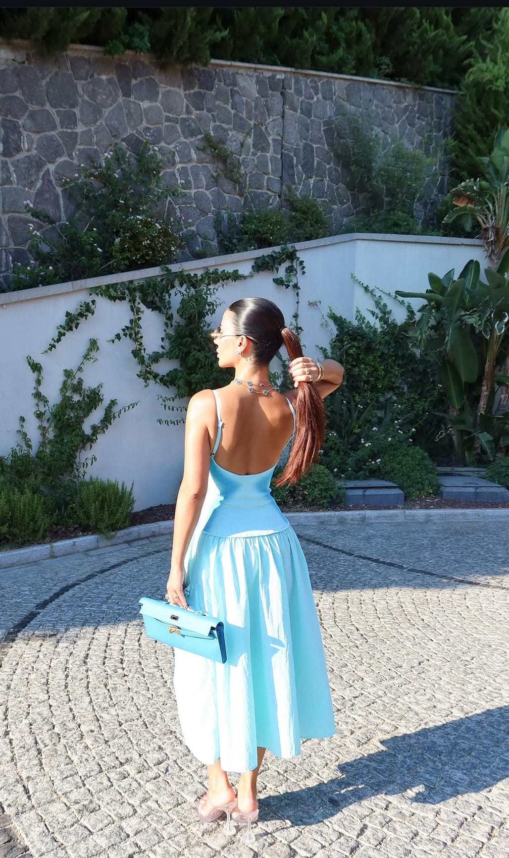 The real artistry is in her use of colour. The dress’s pale aqua tone acts as a tranquil canvas, instantly evoking sea foam and cloudless skies. In contrast, her handbag, a structured Hermès Kelly Cut, comes in a deeper, almost electric blue. It creates a bold yet harmonious dialogue between the two shades. The bag’s sharp, elongated lines introduce a note of sophistication, balancing the soft romance of the dress with a crisp and tailored counterpoint. This interplay of hues transforms the look from simply pretty to visually magnetic.