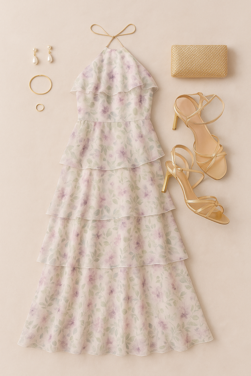 “A flat lay of a pastel floral halter-neck maxi dress with layered chiffon ruffles, laid on a soft beige background. Next to the dress: a pair of strappy gold heeled sandals, a gold beaded clutch, pearl drop earrings, a simple gold bracelet, and a gold ring. The layout is symmetrical and aesthetically pleasing, capturing a soft, elegant, romantic vibe with warm lighting. No shadows, no text, and no background clutter”