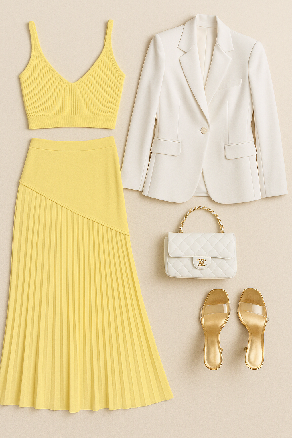 “Flat lay of a stylish lemon-yellow two-piece outfit, featuring a ribbed crop top with thin straps and a high-waisted pleated maxi skirt. Add a white structured blazer, a white quilted Chanel-style handbag with a gold chain handle, and a pair of open-toe heels with clear straps and gold metallic insoles. Set everything against a soft beige background. No text, no models, no extra items—just a clean, minimal, luxury-inspired composition”