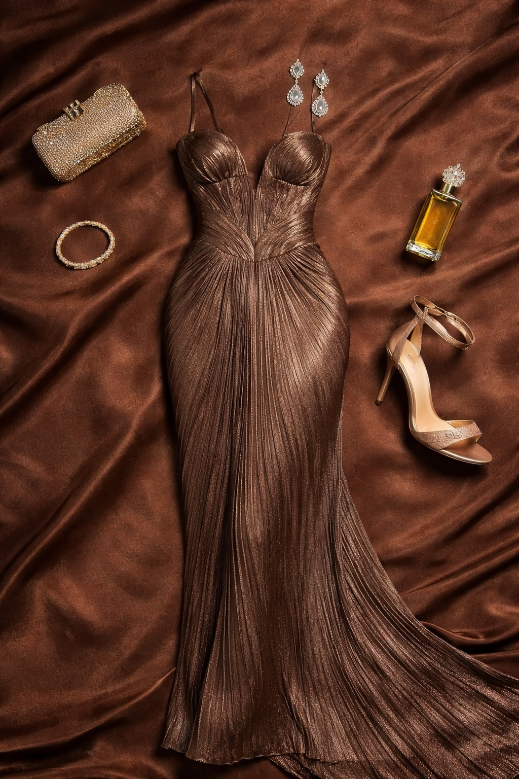 "Ultra-elegant luxury fashion flatlay photographed from a perfectly centered top-down perspective. A sculptural bronze metallic evening gown with a deep plunging neckline, fine pleated texture, and fluid column silhouette is carefully arranged on a rich bronze satin fabric background with soft natural folds and subtle sheen. Surround the gown with refined, coordinated evening accessories placed with balanced negative space: a gold crystal-embellished clutch, diamond drop earrings, a delicate tennis bracelet, warm gold perfume bottle, and nude-gold strappy high-heeled sandals."