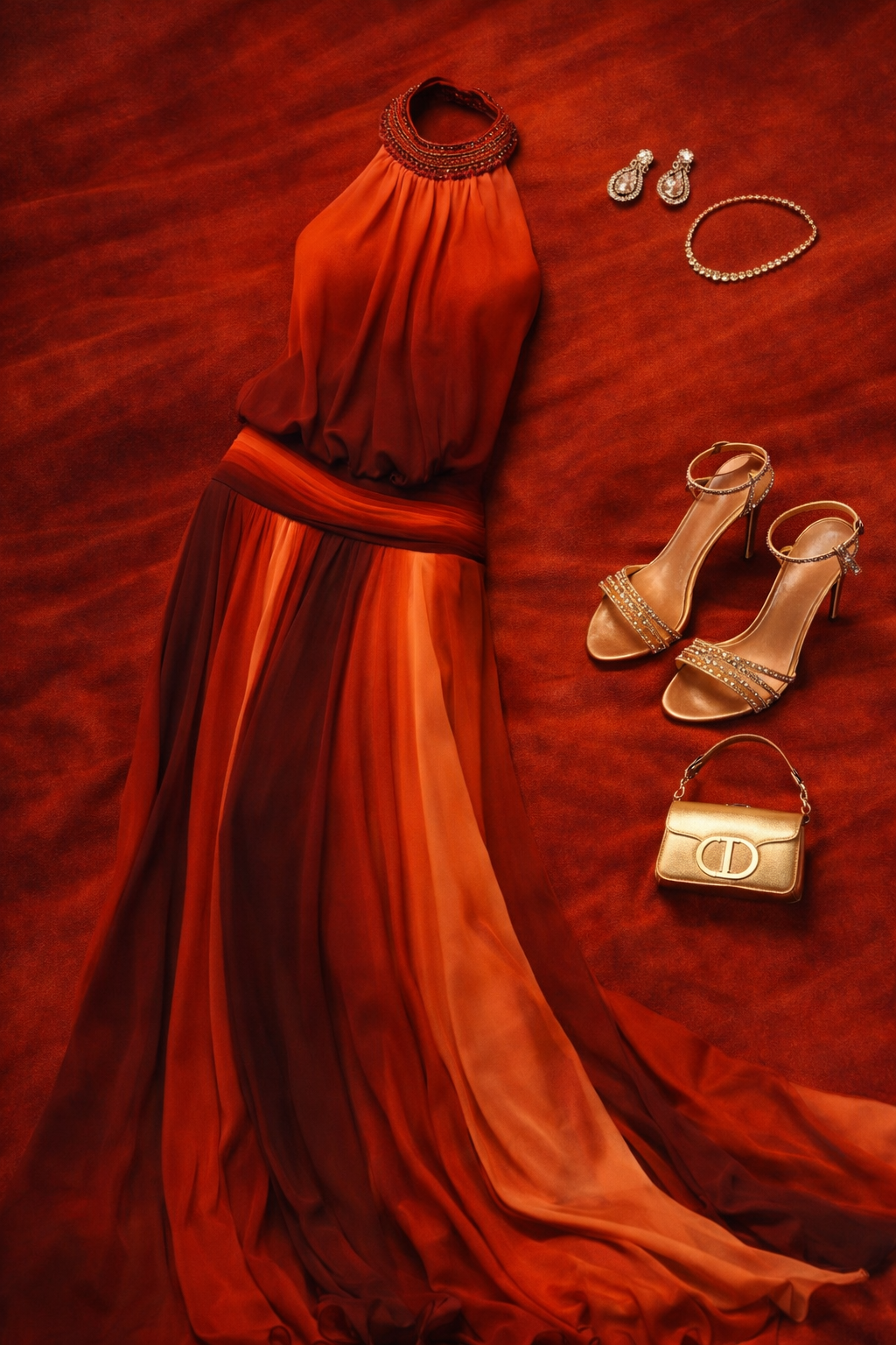 "Create a luxury fashion flatlay centered on an ombré evening gown transitioning from deep ember red to burnt orange and rust tones. The dress features a halter neckline with an embellished collar detail, a softly draped bodice, and a long flowing skirt with layered sheer panels. Style the ensemble with metallic gold strappy heels placed near the hem, a small gold structured clutch positioned at the side, and coordinating gold jewelry such as statement earrings, stacked bracelets, and a beaded collar element arranged neatly above the neckline."