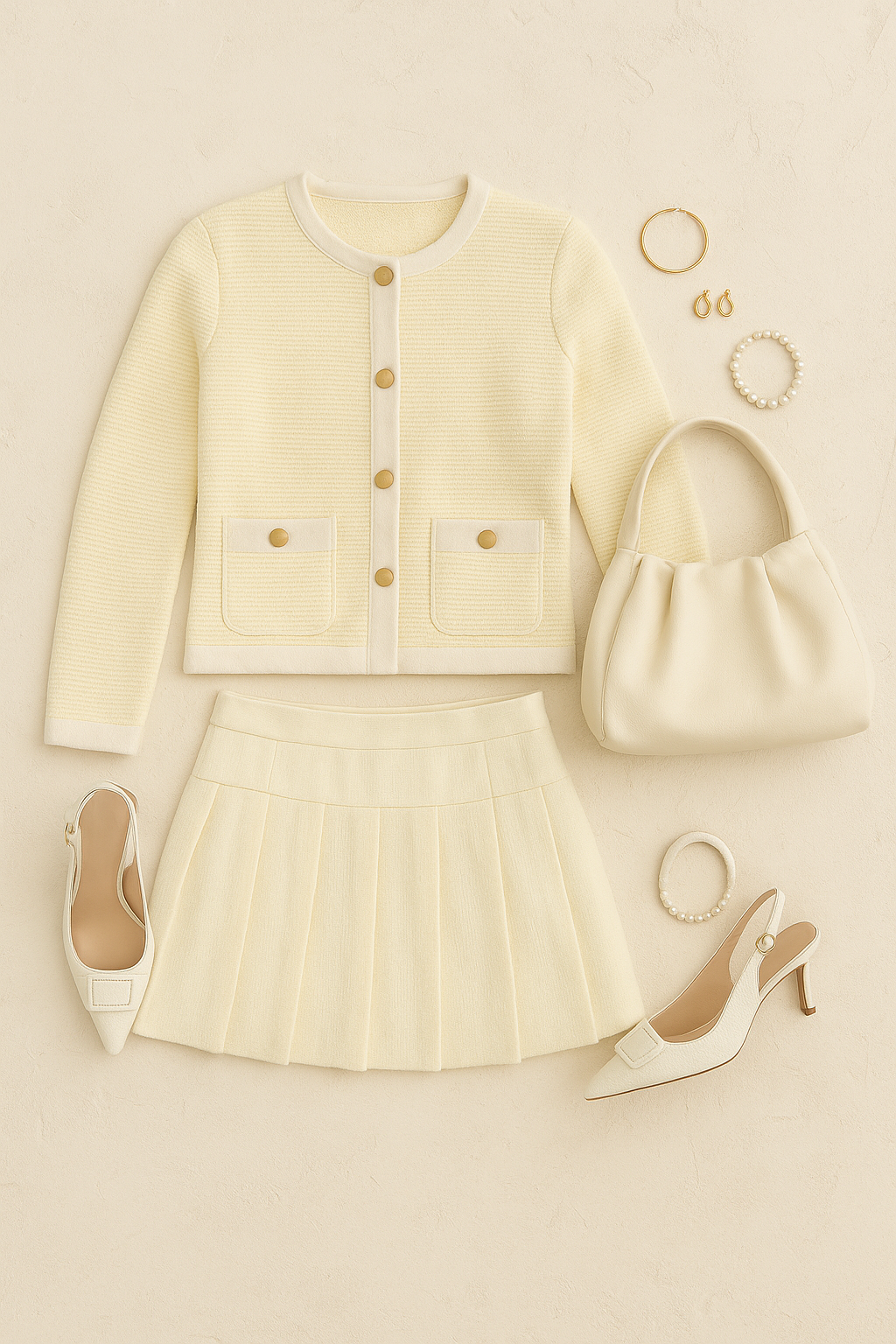 This outfit rests beautifully on the shoulders of a cardigan-style jacket but not just any cardigan. This one is tailored, textural, and trimmed in crisp white, with round matte gold buttons that offer a refined accent. Its cut is clean, collarless, and polished, yet it carries all the comfort of a knit. The piece walks that beautiful line between cozy and composed, soft like spring air, structured like a statement piece.