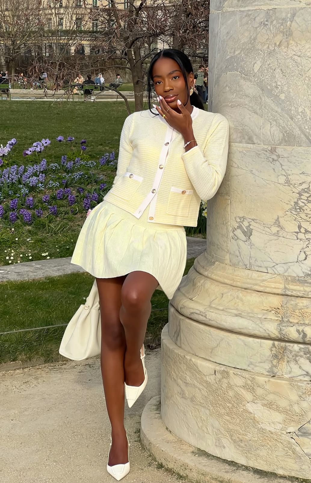 The matching mini skirt continues the story: pleated, flared, and playful. It holds volume without weight, fluttering just enough with each step. Together, the set gives “preppy with poise,” nodding to Parisian garden strolls and vintage silhouettes with a modern edge.
