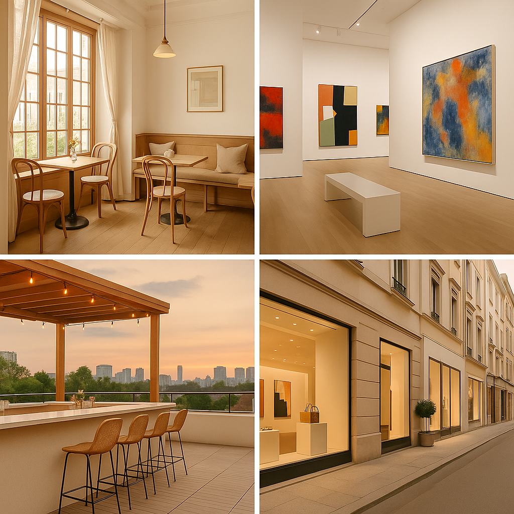 Art Gallery :A minimal modern gallery with bold abstract pieces, ideal for a cultural stroll.