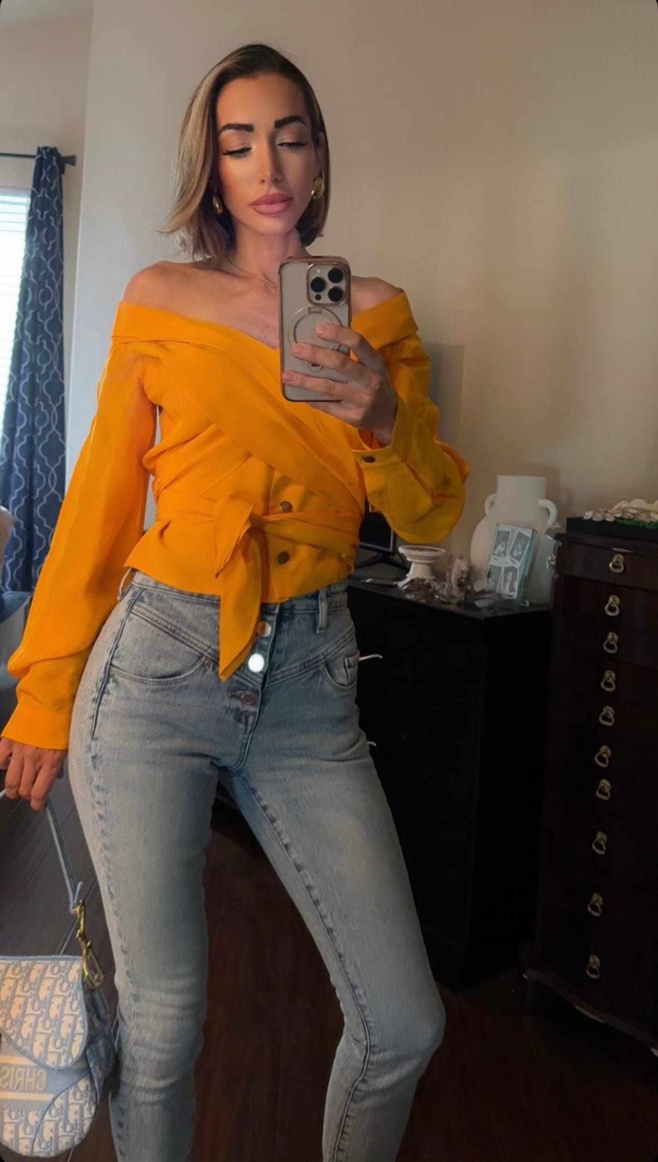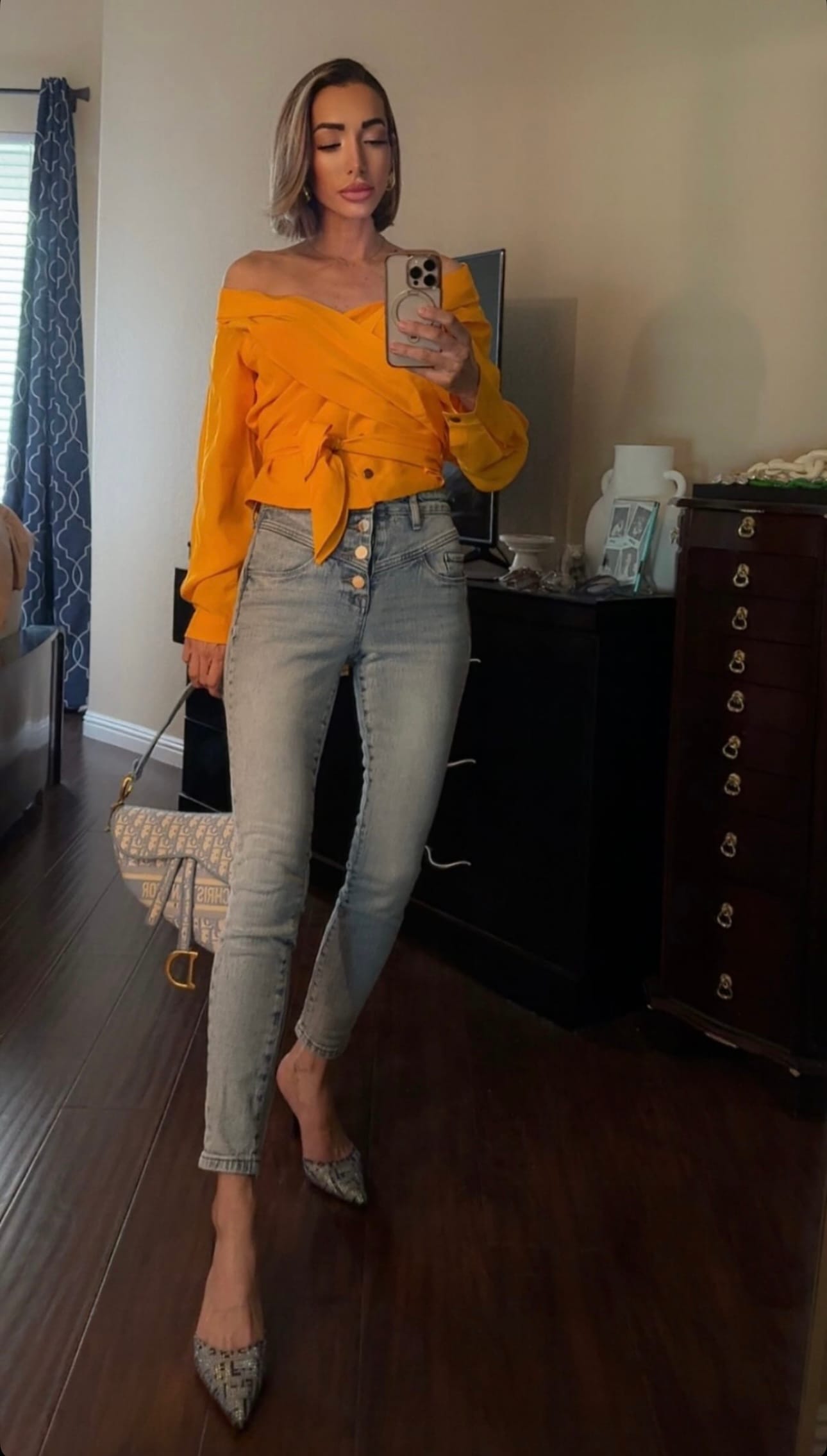 The hero piece is undoubtedly the bold saffron-orange off-shoulder blouse. With its rich hue and draped neckline, it brings both warmth and structure to the look. The wrap-front detail, fastened into a gentle knot, sculpts the waist without feeling forced, it’s that perfect balance between soft and tailored. The color alone demands attention but Amy makes it feel effortless.