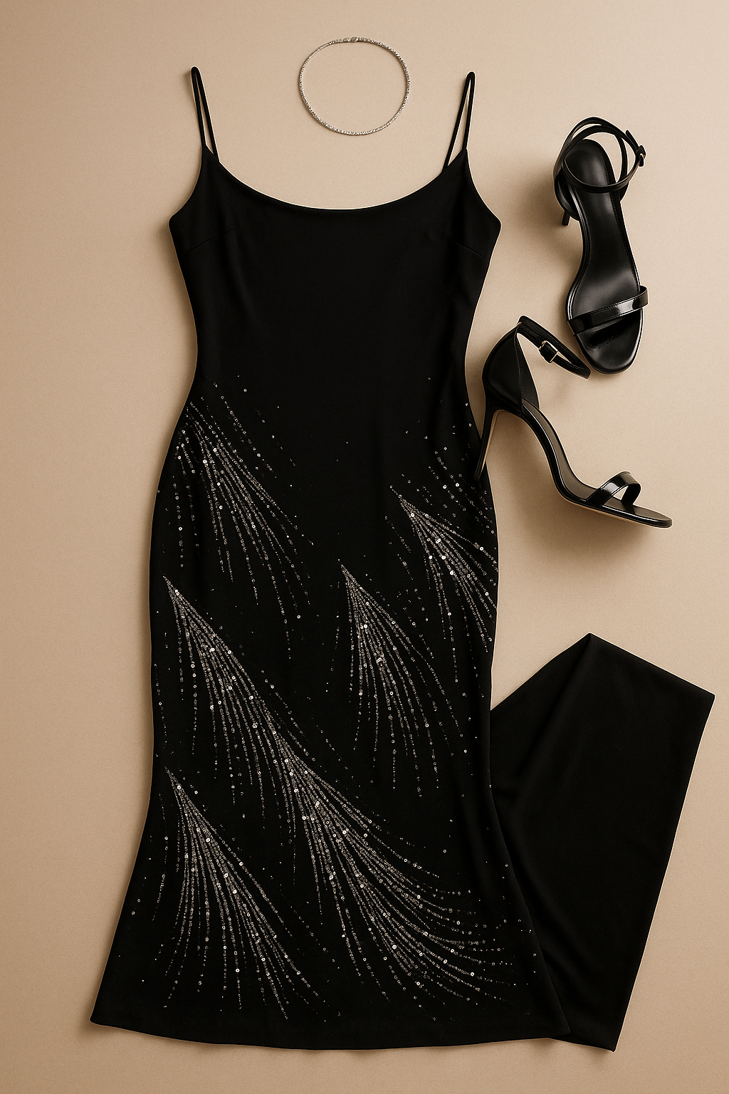 "Create a high fashion flatlay of an elegant black evening gown inspired by Ana de Armas’s red carpet look. The dress should be fully visible and arranged neatly on a warm beige background for strong contrast. The gown features thin straps, a soft curved neckline, and intricate cascading sequin patterns in silver and rose gold that resemble comet trails. Place a pair of minimalist black strappy high heel sandals to the right of the dress. At the top, include a delicate crystal choker laid flat. Use soft, diffused lighting to highlight the sparkle of the embellishments and the smooth texture of the fabric."