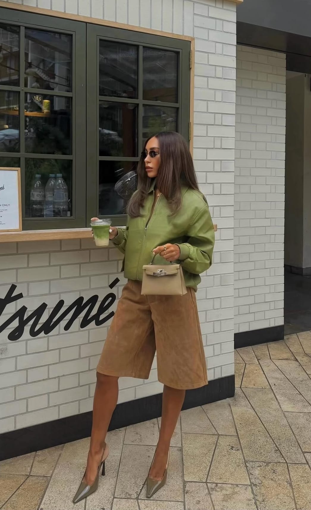 Aimee’s tan suede culotte shorts are a standout piece. Falling just above the knee, their wide-leg tailoring introduces volume, but the soft suede fabric grounds the look with warmth and texture. The shorts’ earthy brown shade provides a natural counterbalance to the green jacket, echoing the tones of nature while maintaining urban refinement.