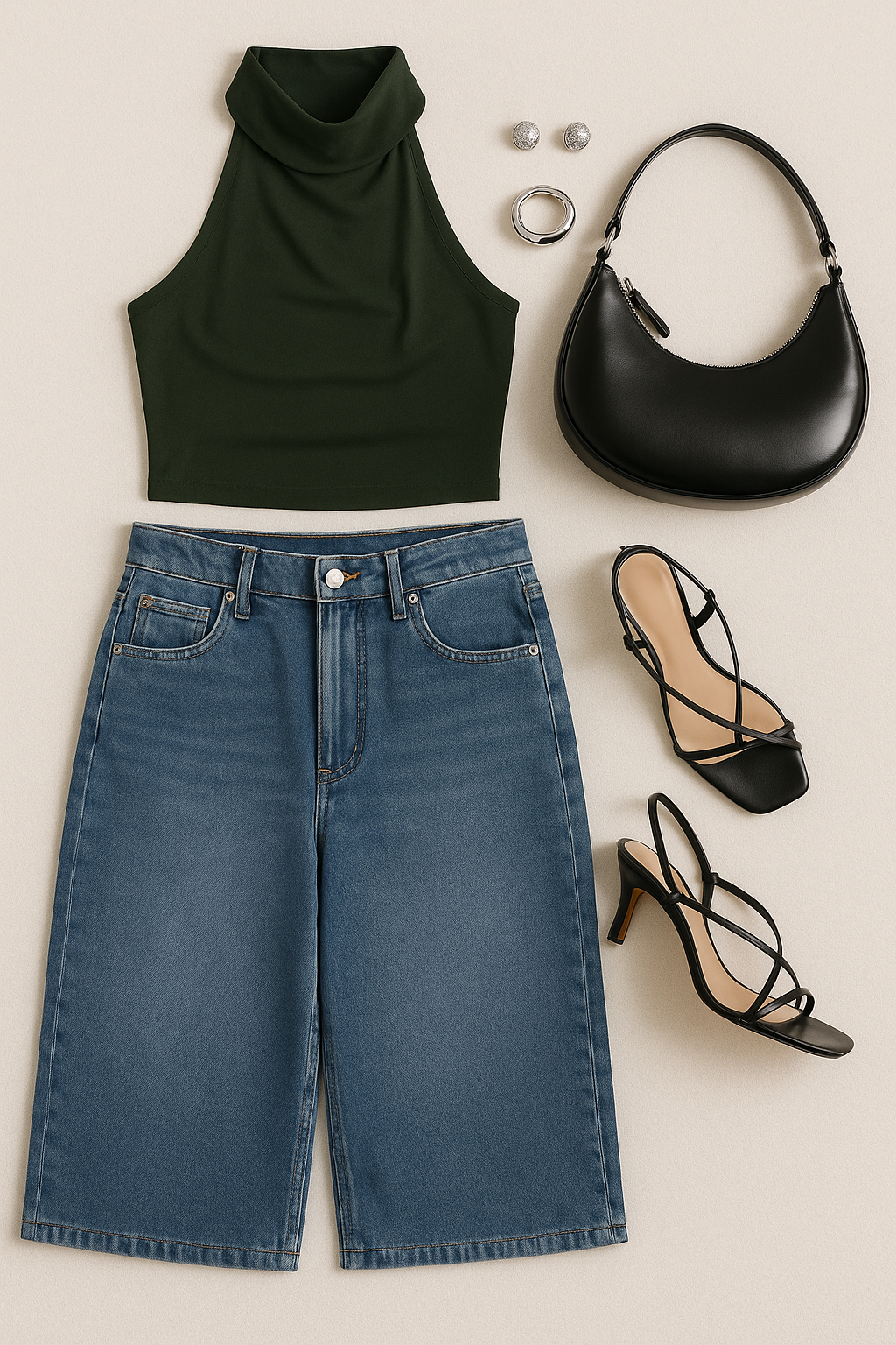 “Flat lay of a forest green halter top with a soft draped neckline, long medium-wash denim Bermuda shorts, black strappy heeled sandals, a sleek crescent-shaped black leather handbag, silver dome ring and twisted hoop earrings, styled on a neutral cream background in an editorial layout.”