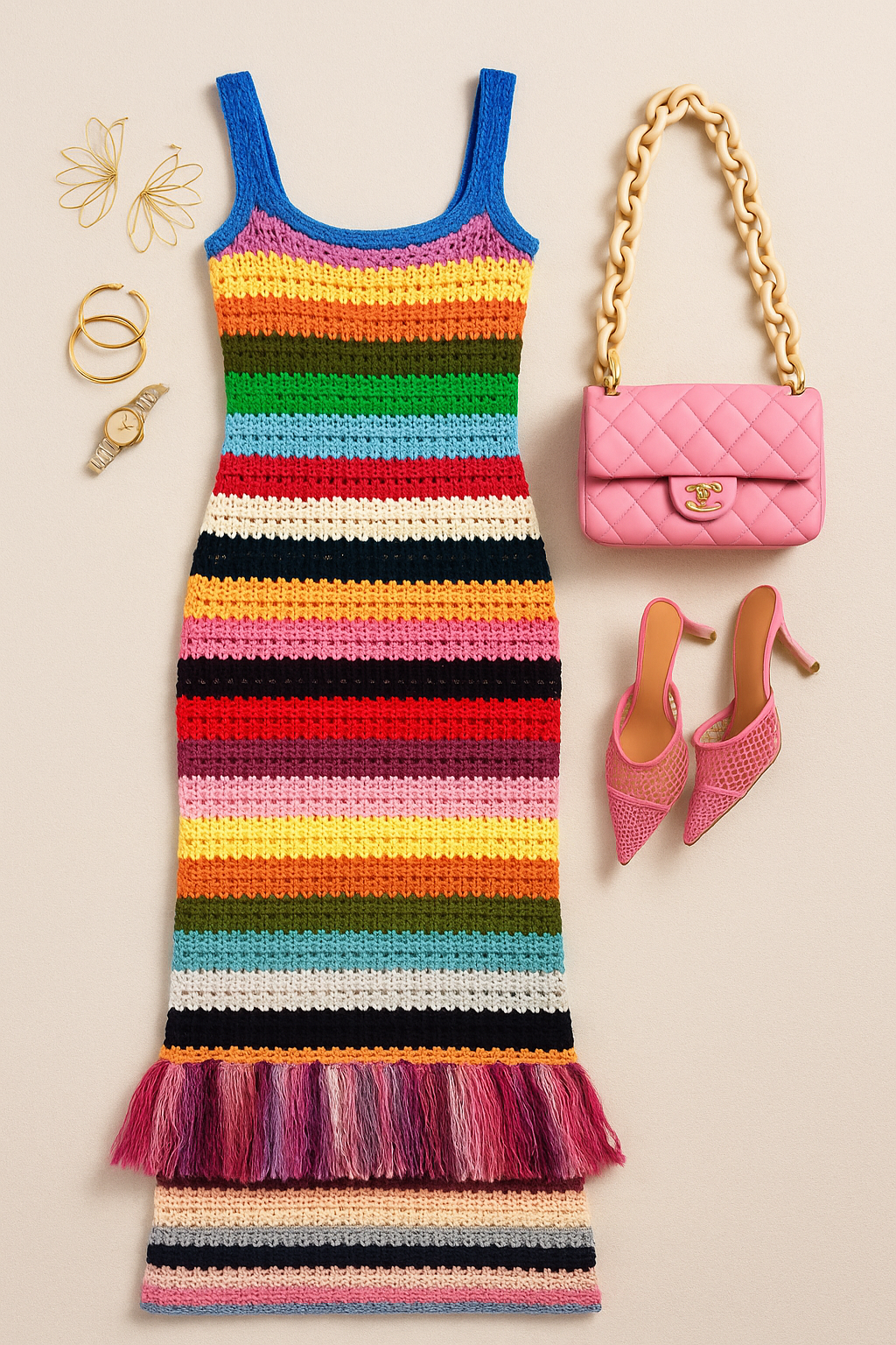 “A high-resolution flat lay of a colorful crochet maxi dress with wide shoulder straps and bold horizontal stripes in rainbow hues, including bright blue, red, yellow, pink, green, and pastel tones. The dress features a thick multicolor fringe near the bottom and additional soft-toned crochet layers beneath. It is styled with a pair of pink mesh stiletto mules, a quilted pink Chanel-style handbag with a chunky cream chain strap, and gold jewelry (including floral wire earrings, a wristwatch, and stackable bangles). All items are neatly arranged on a neutral cream or beige background in a clean, editorial composition”
