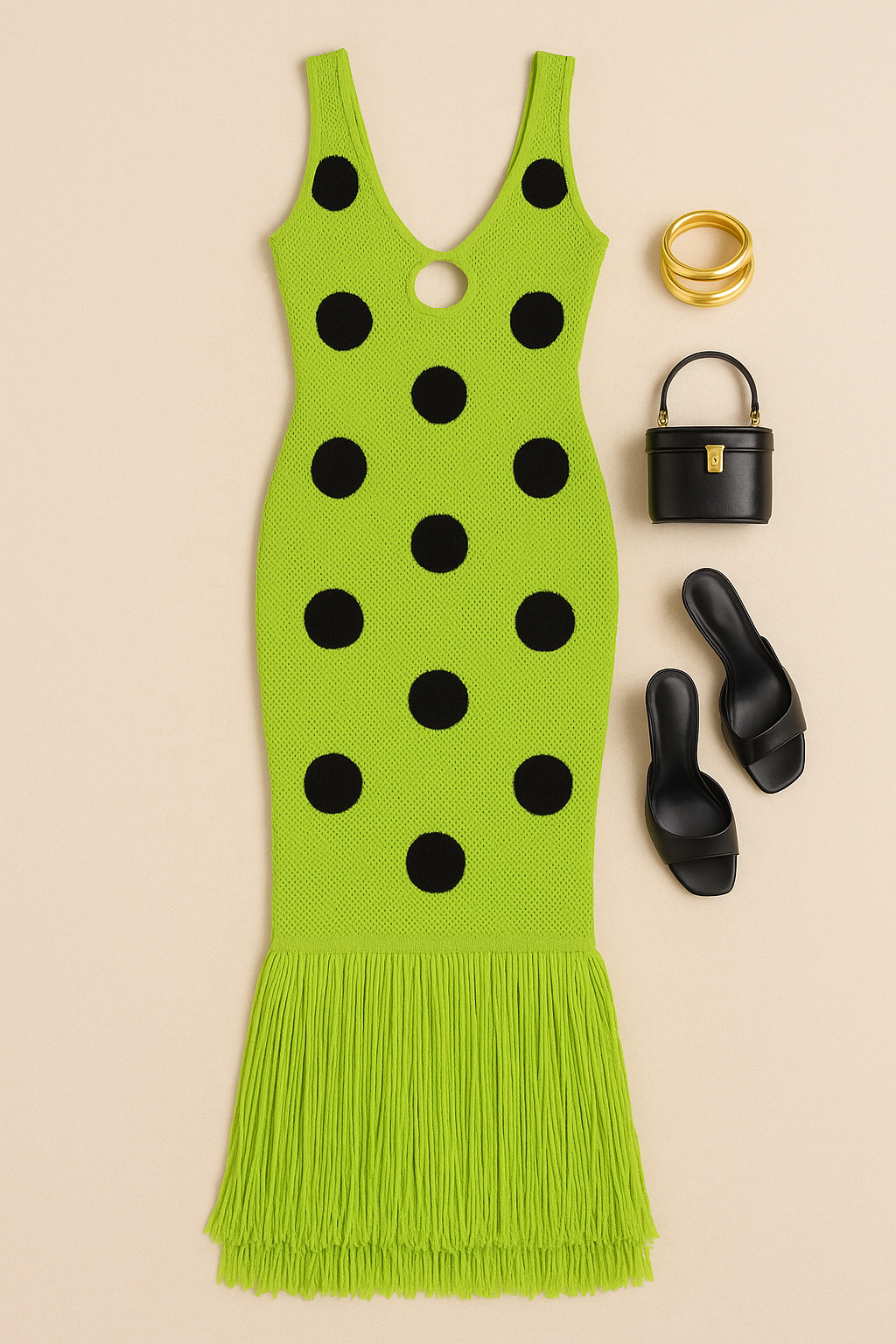 “A flat lay image of a vibrant lime green crochet maxi dress with large black polka dots and a fringed hem, arranged neatly on a warm beige background. To the right of the dress: a pair of black minimalist heeled sandals, a structured mini black handbag with gold hardware, and two chunky gold bangles. The layout is clean, symmetrical, and styled with a chic, tropical-luxury aesthetic”