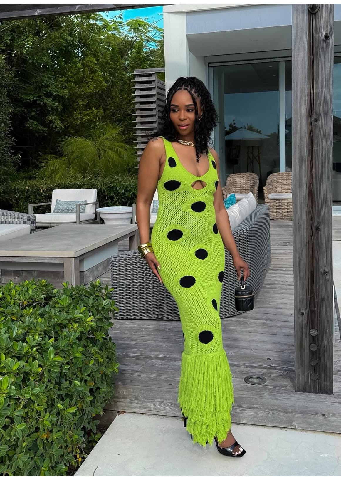 Brittany Johnson effortlessly commands attention in a daring lime-green crochet dress punctuated with bold black polka dots—a true embodiment of summer confidence and flair. The vibrant hue of this crochet masterpiece evokes feelings of freshness and exuberance, ideal for standout moments during balmy days or tropical getaways.