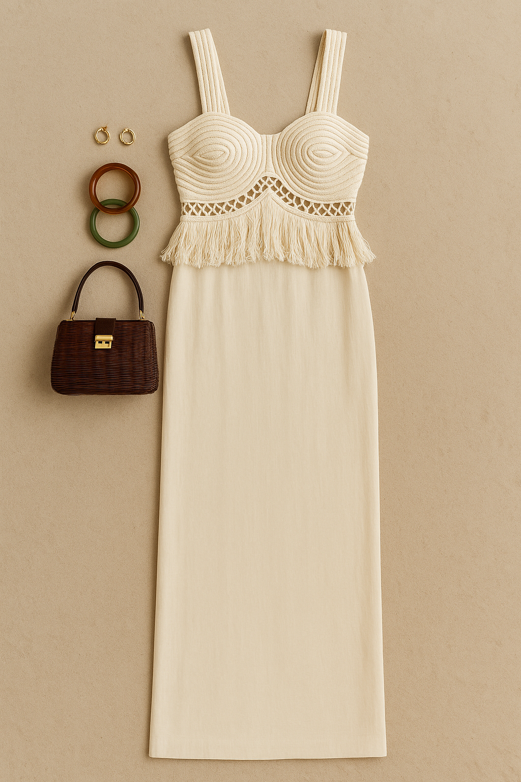 “Flat lay of a full straight cream dress with a sculptural rope-detailed bodice featuring circular embroidery, ivory tassel fringe at the waist, and a floor-length skirt. Place accessories neatly beside it: a compact woven brown handbag, layered bangles in jade and amber, and small gold hoop earrings. Background should be a warm sand-toned surface, evoking coastal elegance. No shoes, no models just the dress and accessories in a refined flat lay arrangement.”