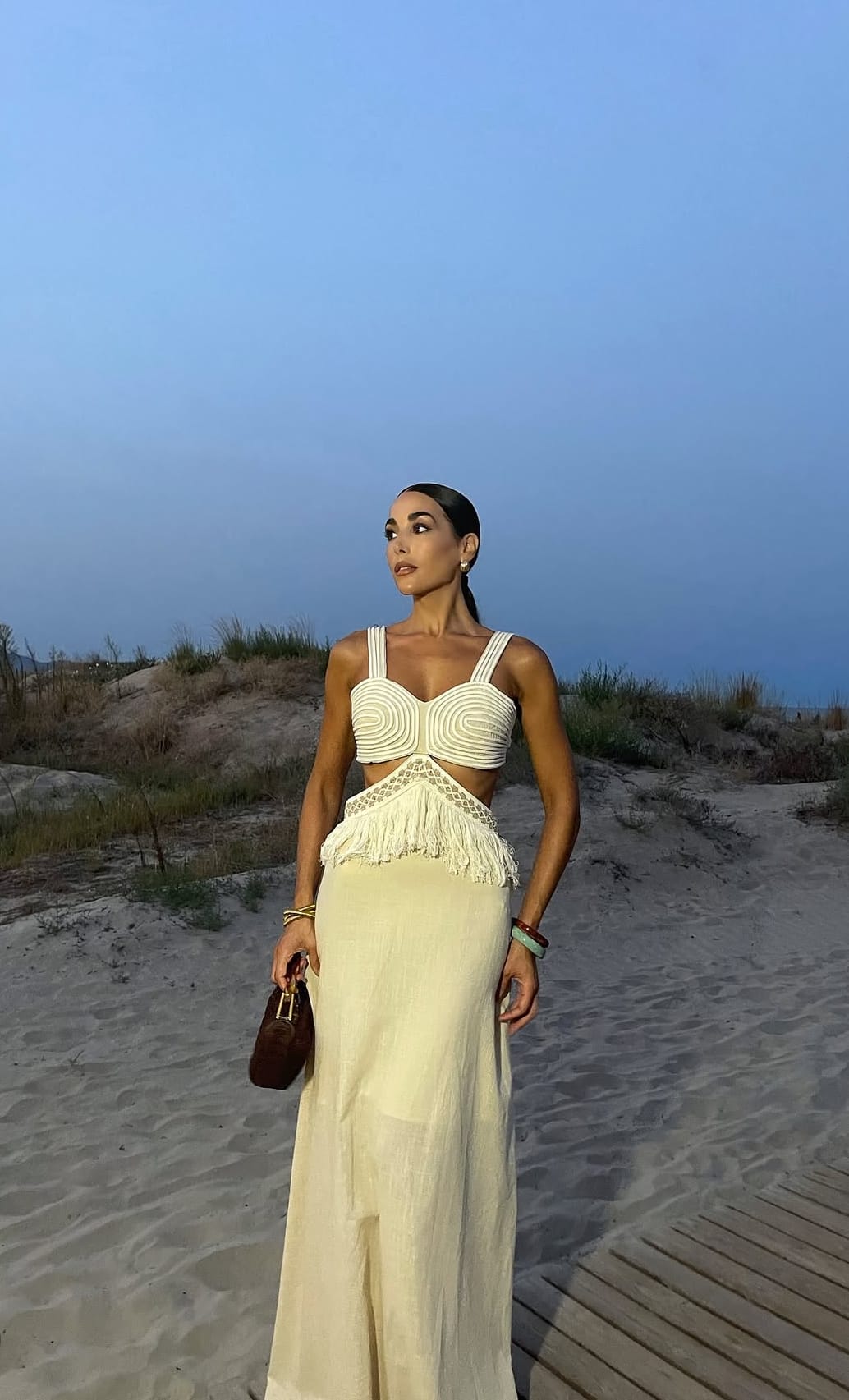 The evening was slowing down when Tania Ayuso appeared against the fading sky, the dunes stretching behind her like a painting in muted tones. The sea breeze softened, the last colors of daylight slipped into the horizon, and her dress seemed to absorb every element of that scene. This wasn’t just a summer look; it was a reflection of the landscape itself, pulled together with intention and quiet power.