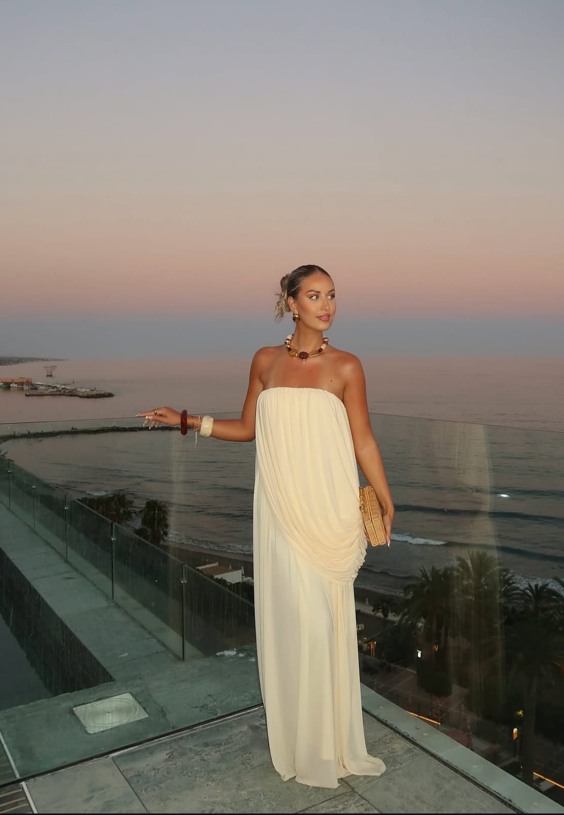 Against the backdrop of a pastel Marbella sky, the ocean stretching out behind her, Katherine Bond doesn’t just wear the moment—she becomes it. This ensemble is the embodiment of summer serenity and effortless luxury. A look that proves Katherine isn’t just dressing for the season; she’s setting the tone for it.