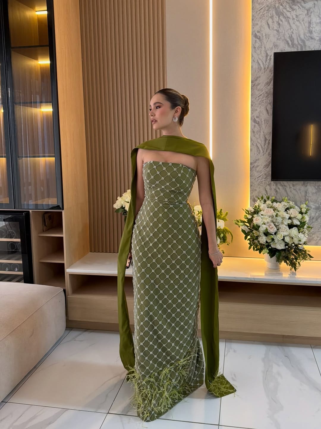 A sense of grounded elegance defines the way the dress asserts itself, shaped by a tone that feels organic yet elevated. The green settles somewhere between olive and moss, offering depth rather than brightness and lending the gown a quiet sense of luxury. Instead of reflecting light sharply, the fabric absorbs warmth, creating a softened glow that feels calm and assured. This choice speaks to maturity and confidence, steering away from trend driven excess in favor of something more enduring and refined.