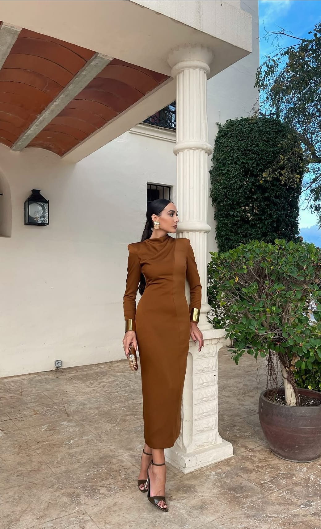 Tania’s fitted, long-sleeve brown midi dress is a masterclass in refined tailoring. The structured shoulders gave the silhouette a strong frame, while the softly draped neckline introduced fluidity. The length, grazing just above the ankles, offered an elegant restraint that emphasized her shoes without overexposure. The earthy brown shade was the hero, grounding the entire look in warmth while still feeling seasonally appropriate and modern. It’s the kind of color that doesn’t scream for attention but instead commands it in quiet confidence.