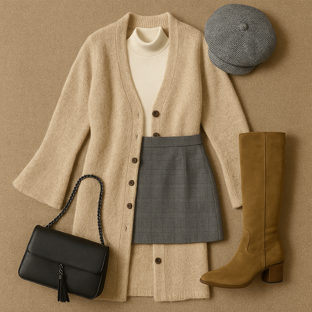 “Create a realistic flatlay of a stylish autumn outfit arranged neatly on a neutral beige or oatmeal-textured background. Include a long beige knit cardigan with buttons and flared sleeves, a cream turtleneck top, a gray plaid mini skirt, olive or tan suede knee-high boots, a gray newsboy cap, and a black handbag with a gold or chain strap. The layout should feel cozy, elegant, and minimalist, with soft natural lighting and warm tones that evoke fall fashion.”