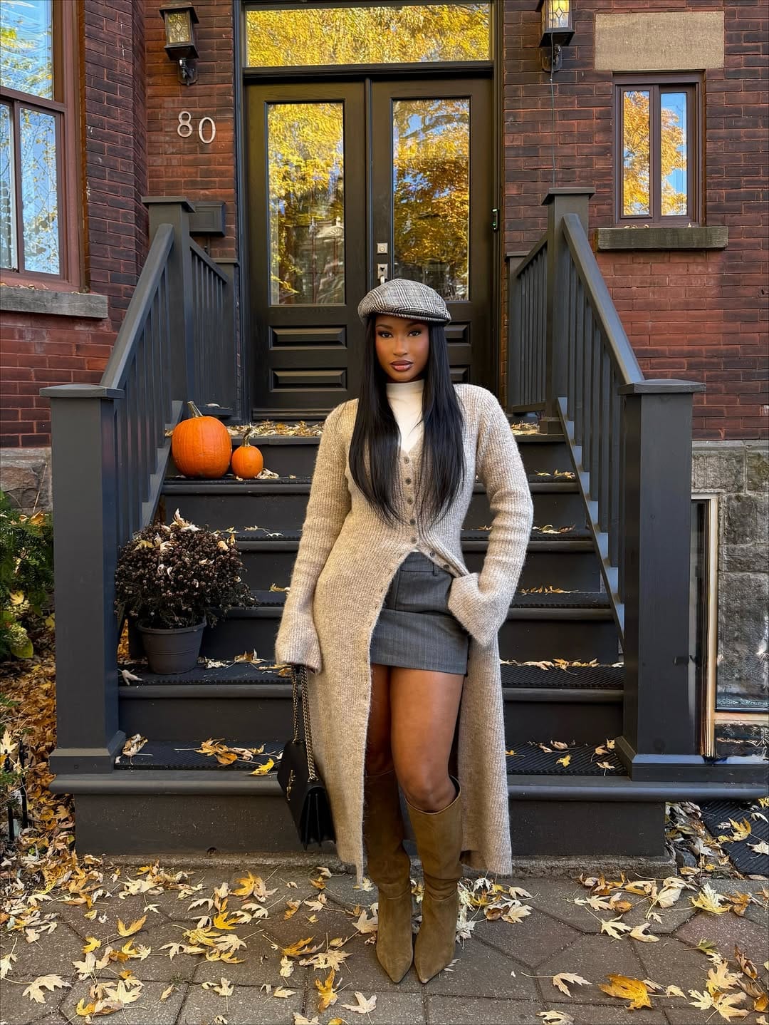 As the golden light of autumn spills over the quiet streets, Aicha Drame steps into the frame with an ensemble that captures the very essence of the season. Her outfit feels like a soft conversation between warmth and structure, blending coziness with refined detail. Standing before a classic brick townhouse surrounded by crisp leaves and pumpkin accents, she embodies the kind of effortless elegance that makes fall fashion feel both familiar and elevated.