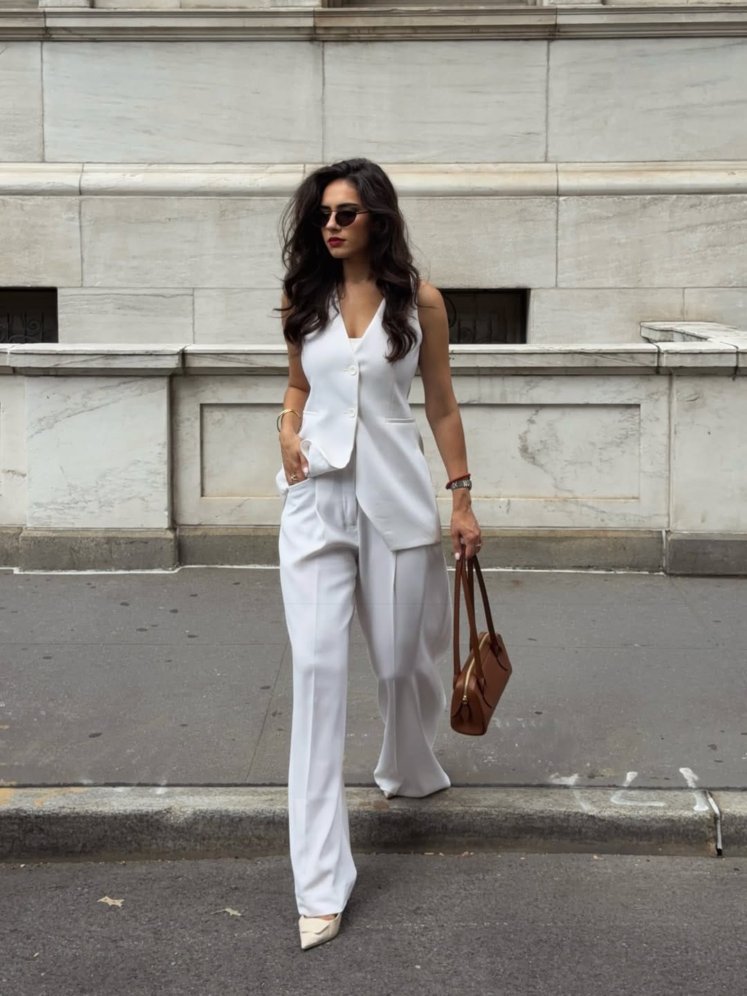 A crisp white vest replaces the traditional blazer and instantly shifts the mood from office uniform to polished street style. The vest is cut with a deep V that lengthens the neck and reveals just a hint of collarbone. Two clean buttons close the front and create a sculpted hourglass without the need for a belt. Sharp seams travel down the torso and keep the fabric close to the body. The armholes are carved high so the shoulder line stays neat. This is precision work and it shows from every angle.