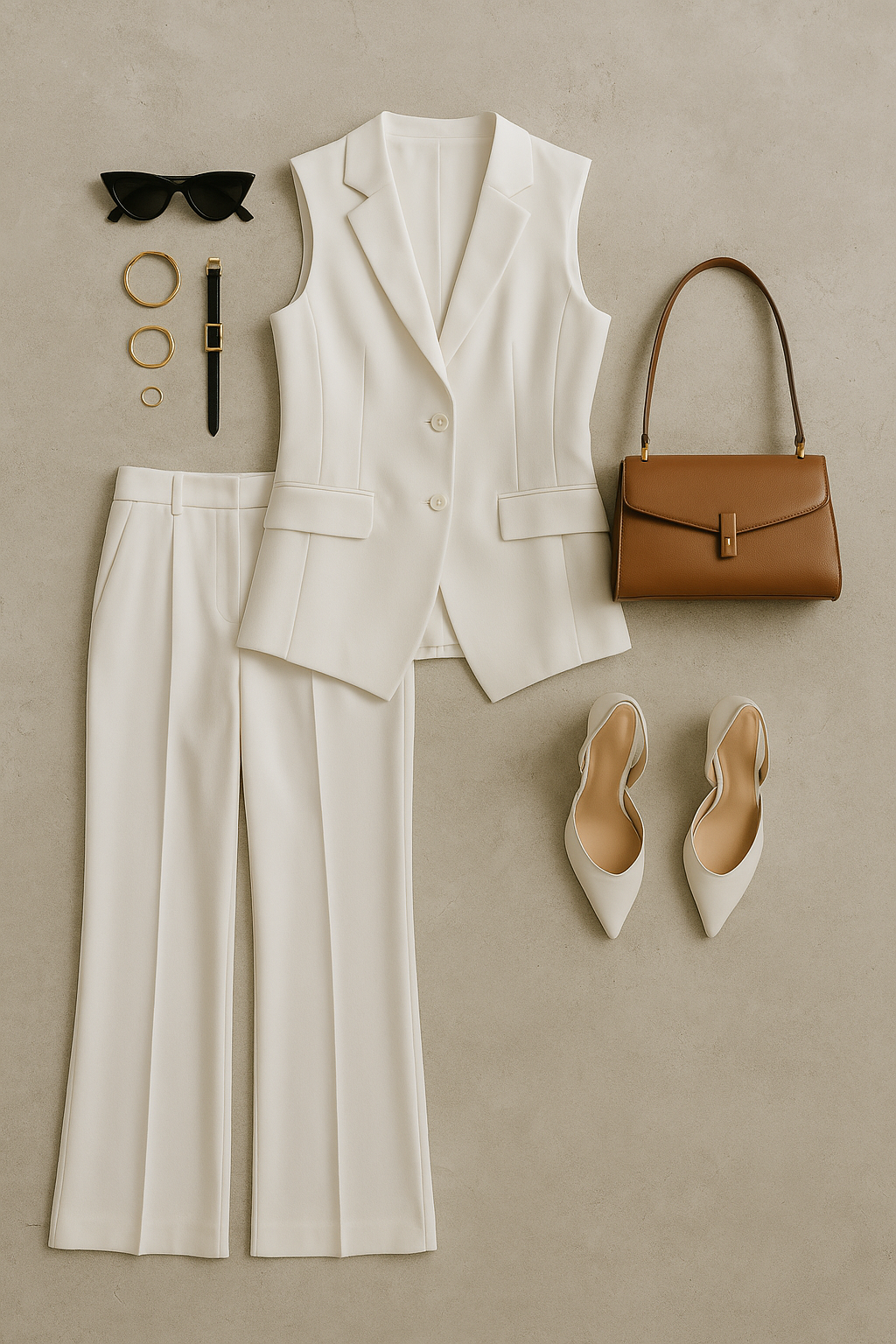“Create a high-quality flatlay of a sophisticated minimalist outfit arranged neatly on a warm stone or ivory textured background. Include a crisp white tailored vest with buttons, matching wide-leg trousers made of light, structured fabric, cream pointed-toe heels, a tan leather shoulder bag, black slim rectangular sunglasses, a gold bangle, and a wristwatch. Add soft shadows and natural light to enhance the texture and elegance of the items. The layout should feel editorial and refined, inspired by luxury street style photography.”