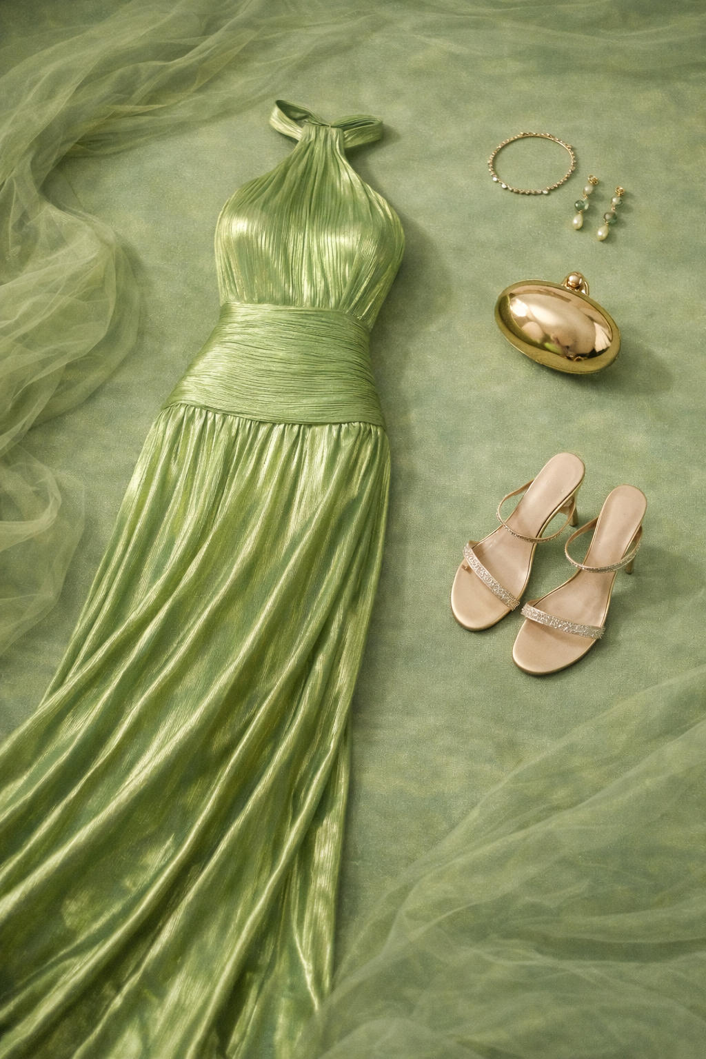 "An editorial fashion flatlay photographed from directly overhead on a deep olive green and warm bronze background inspired by modern architectural interiors. At the center lies a metallic green halter neck evening gown with fine pleated texture and a softly cinched waist. The halter neckline is laid flat and symmetrical to highlight the gathered construction, while the skirt is arranged in long, fluid folds to emphasize movement and sheen. The fabric reflects light subtly, creating a liquid effect across the surface. Styled with a small spherical gold clutch placed beside the waist area and minimal gold jewelry arranged sparingly."