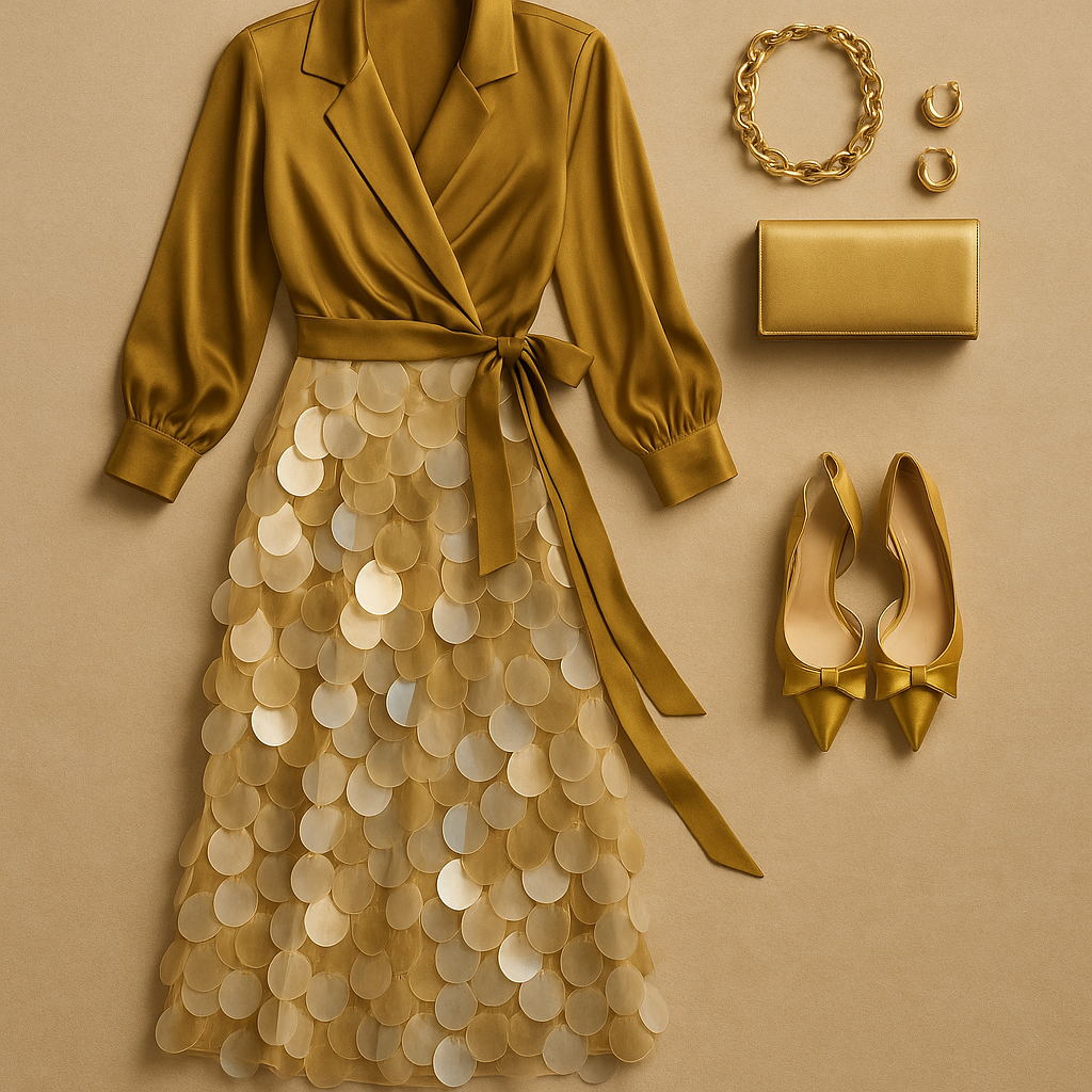 "Flatlay of a luxurious evening party outfit arranged neatly on a warm beige background. Include an olive satin wrap blouse with long sleeves and tie waist, paired with a statement midi skirt made of oversized iridescent sequin discs layered like petals. Add a structured gold metallic clutch, gold pointed toe heels with decorative bow detail, chunky sculptural gold chain necklace, and matching gold hoop earrings. Use soft ambient studio lighting with gentle shadows, clean balanced composition, refined celebratory aesthetic, glamorous and high fashion styling, quiet luxury atmosphere."