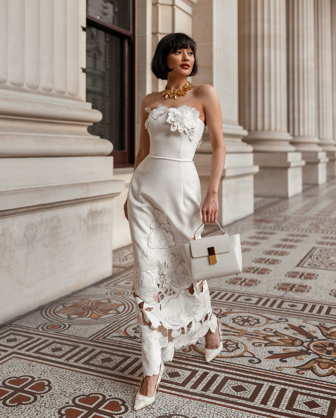 The handbag continues the theme of controlled luxury. Structured, ivory-toned, and accented with a gold clasp, it mirrors the color palette and reinforces the clean geometry of the overall styling. Its boxy silhouette adds an editorial edge, preventing the look from leaning too heavily into romantic territory. It feels intentional, polished, and modern.