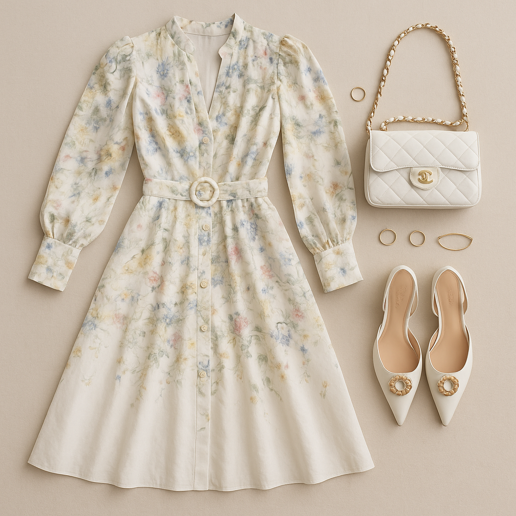 There is something undeniably graceful about the way this look comes together. The florals feel soft yet intentional, a delicate nod to timeless romance, while the accessories bring just the right balance of polish and quiet luxury. Every detail works in harmony, creating an image of elegance that feels both modern and effortless. It is the kind of style that speaks without needing to raise its voice.