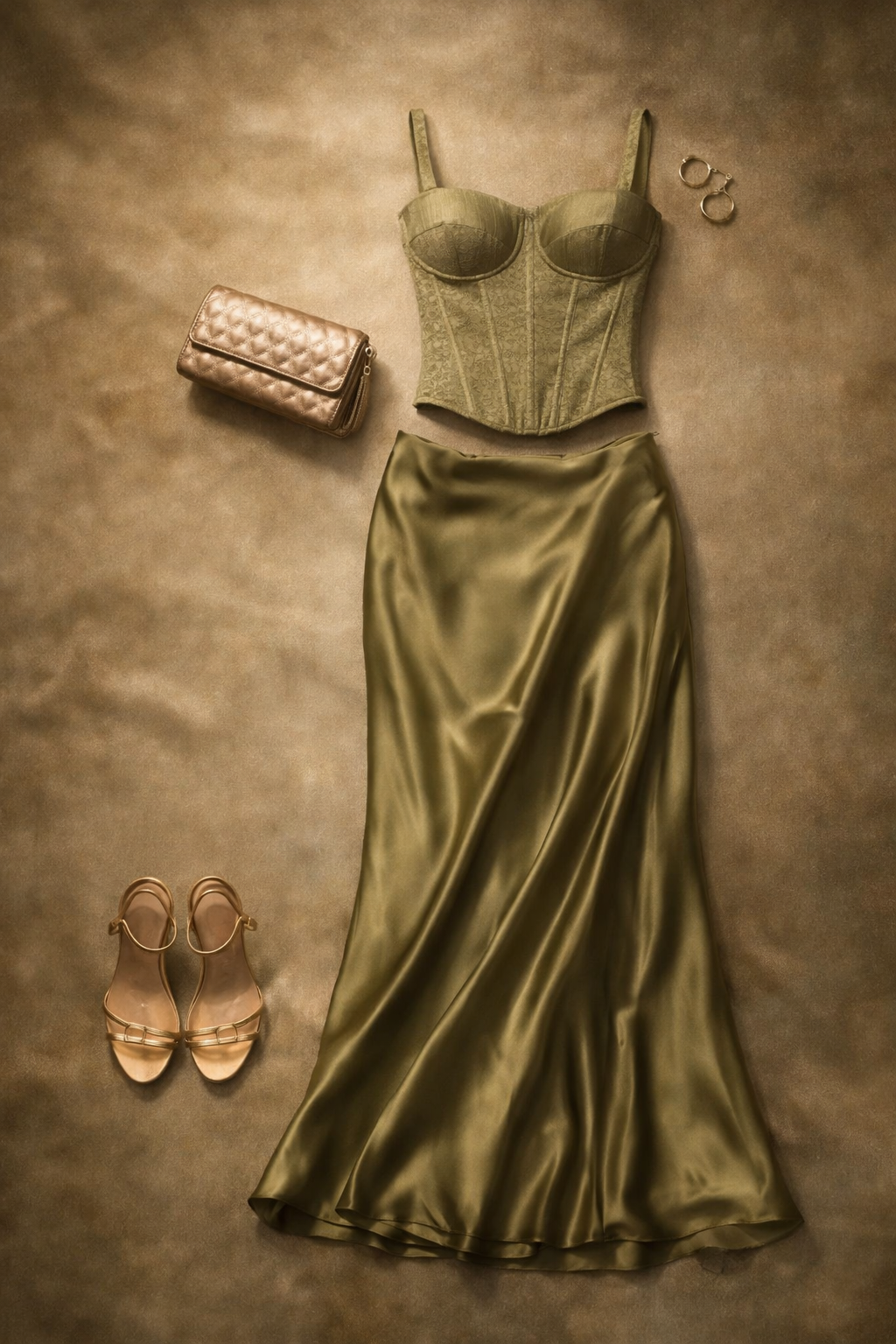 "A high-fashion editorial flatlay photographed from directly overhead, featuring an olive green satin maxi skirt laid smoothly and centered, with a subtle sheen and fluid drape. Above it, a structured corset top in a matching olive tone is placed neatly, showcasing boning details and a sculpted bodice shape. The background is a warm olive and champagne blended surface with a soft satin texture that mirrors the outfit’s glow. To one side, a metallic gold clutch with a soft reflective finish is positioned cleanly. Below the skirt, a pair of delicate gold strappy heels are arranged symmetrically, angled inward. Add minimal gold jewelry including small hoop earrings and a thin bracelet placed sparingly."