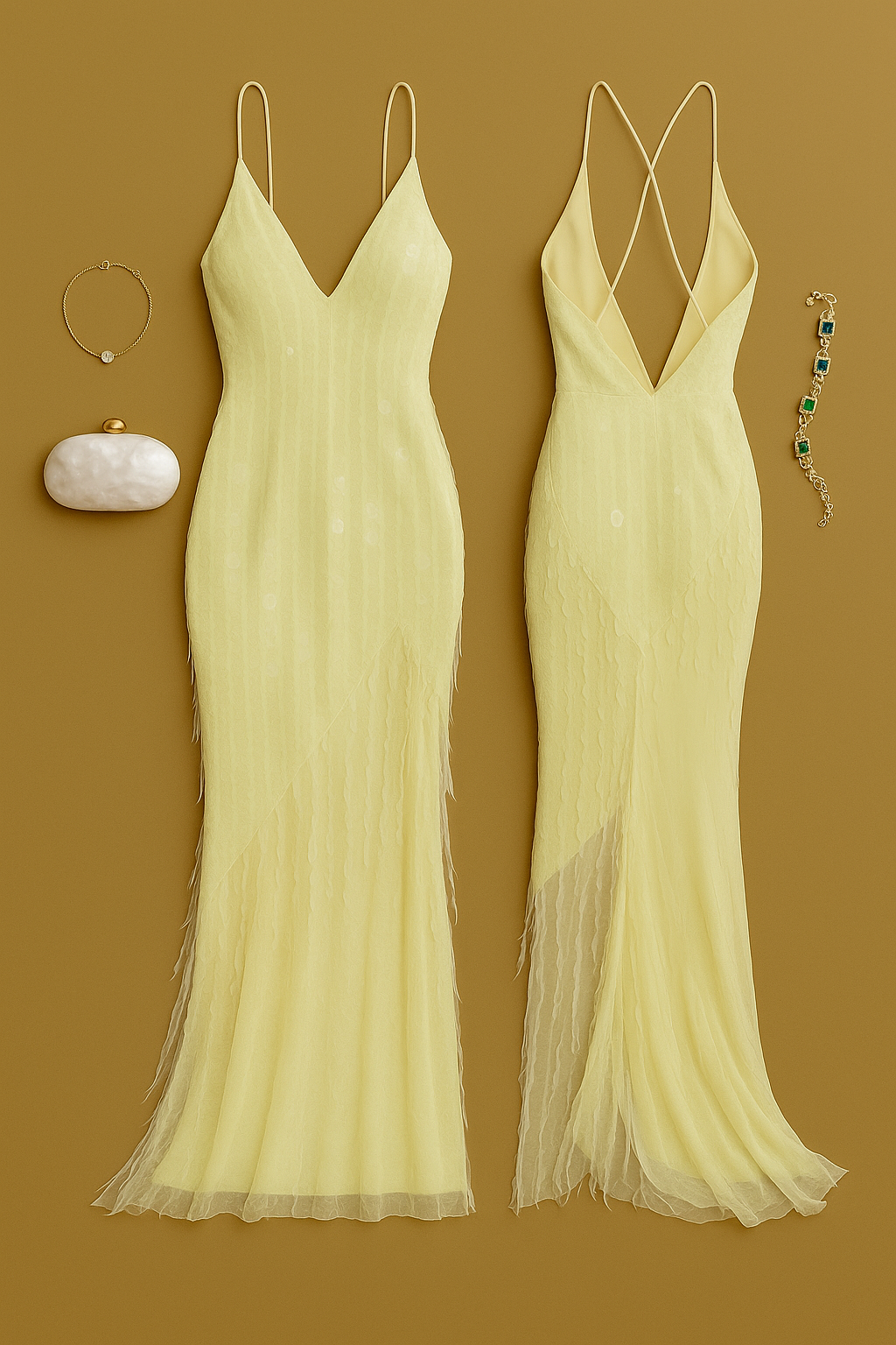 “A flat lay of an elegant yellow sheer evening gown displayed from both front and back, featuring thin spaghetti straps and delicate texture detail. The dress is paired with accessories including a pearl-white clutch, a minimal gold bracelet with a round charm, and a luxury green gemstone bracelet. The background is a warm caramel or ochre tone, and the layout is perfectly symmetrical, high-resolution, with soft natural lighting. No shadows, no models, no text—just the dress and accessories neatly arranged.”