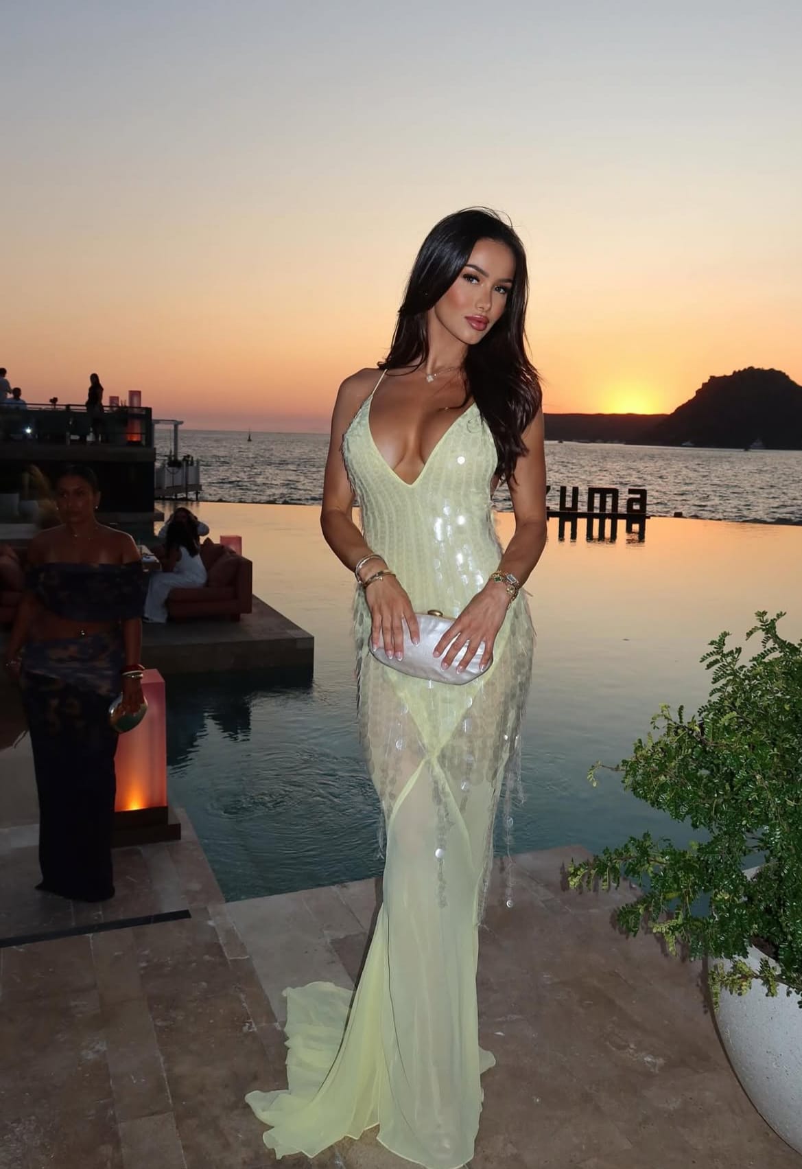 Accessories were kept thoughtful.Maddy clutches a structured mother-of-pearl minaudière with a golden clasp, catching the last of the sunset’s shimmer like a seashell kissed by dusk. On her wrists, a curated mix of bangles and bracelets in gold and green gemstone detailing adds rhythm to the look without overpowering the dress’s sparkle. A delicate pendant rests against her collarbone, understated yet intentional, letting the deep V neckline frame it like art. Her nails? Almond-shaped and coated in a soft ballet pink—refined, polished, and perfectly consistent with the luxury of the ensemble. Everything works in harmony, flowing with grace and just the right dose of glamour.