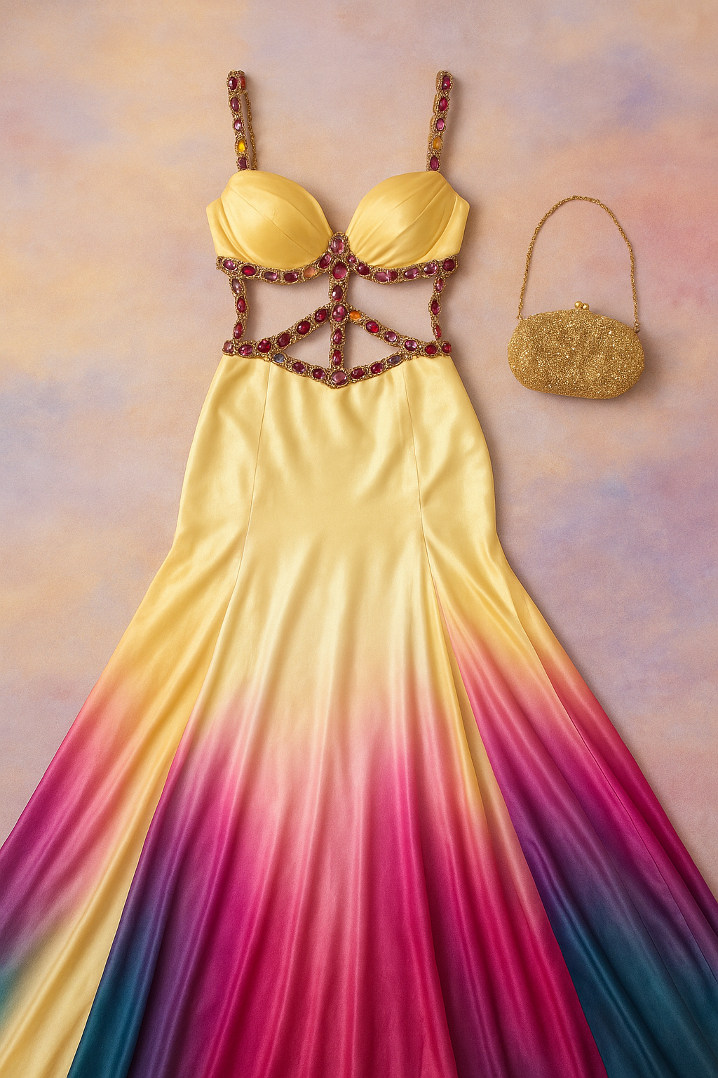 “Flat lay of an elegant evening gown arranged on a soft background. The gown features a golden yellow satin bustier with multicolored gemstone straps and jeweled harness detailing across the bodice, leading into a flowing ombré skirt that fades from yellow into vibrant magenta, purple, and teal at the hem. A sparkling gold clutch is placed neatly beside the gown to complete the ensemble. The background should be smooth and softly lit, blending warm tones that echo the colors of the dress for a harmonious look”