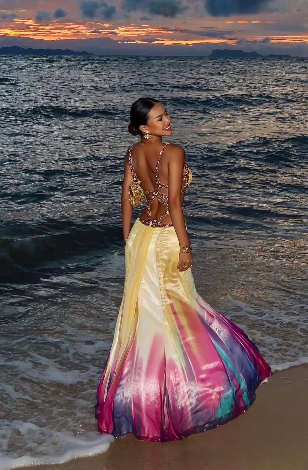 The power of this ensemble lies in how it interacts with the scene around her. The yellow mirrors the sky’s glow, the jewel tones bleed into the horizon, the crystals reflect the first stars of evening. It is not just a gown but a continuation of the ocean and the sunset, turning Natcha into a living extension of the twilight she stands in. This is a look made for moments that deserve to be remembered, where the dress is not only worn but becomes part of the story.