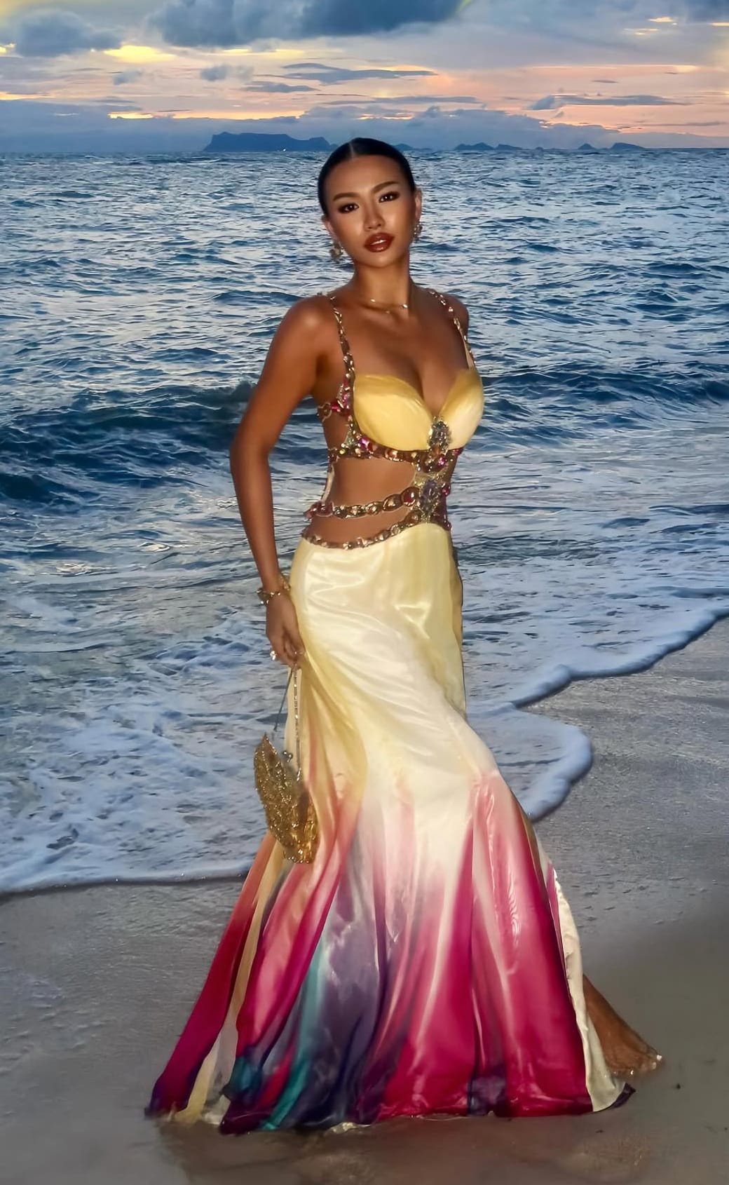The base is a buttery satin yellow that gives warmth and light, almost glowing against her skin, and then the fabric melts into a gradient of pinks, purples, and teal at the hem. The effect is like a sunset poured into silk, a painting that moves with her as the waves curl at her feet. The dress is built with precision in the bodice, a balconette shape that cups the bust in golden satin, while jeweled straps glitter as they run over her shoulders and across her torso. These jeweled chains wrap her waist in a harness-like pattern, framing her figure and catching the last light in sharp, shimmering bursts.